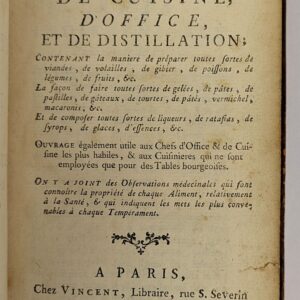 Paris: Chez Vincent, 1767.Portable dictionary of cooking, office, and distillation: containing the manner of preparing all kinds of meats, veal, game, fish, vegetables, fruits, etc.: the manner of making all kinds of jellies, pastes .. : and of composing all kinds of liqueurs .. : work equally useful to the most skilled office and kitchen chefs .. : medical observations have been added which make known the property of each food, relative to health, and which indicate the foods most suitable for each temparment.