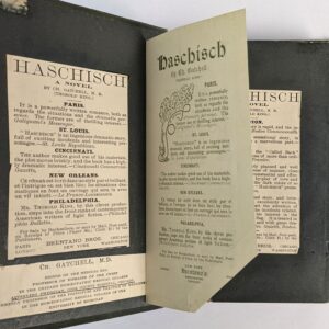 New York: Brentano’s, 1888.First published in 1886 under the pseudonym Thorold King, a novel of narcotic experience following a young Englishman who travels to Egypt, becomes addicted to hashish, and experiences vivid hallucinations. Gatchell was known for his interest in and personal experimentation with cannabis indica extract. In an 1889 letter (sold at auction by Alex Autographs, 2012), he provided detailed instructions on smoking the resinous extract, stating that in his book “there are many facts and many actual experiences” and that it was “possible for you to repeat everything there described.” This copy, probably the author’s own, with a manuscript note on the title page reading: “Published originally by A. C. McClurg, who sold 3 editions. Then I turned it over to Brentano’s who published and sold 3 more editions. C.” Various advertisements and promotional materials for the book are glued to the pastedowns and endpapers. Among the relatively few 19th-century novels to treat cannabis, marijuana, and hashish in a broadly positive or experiential light.