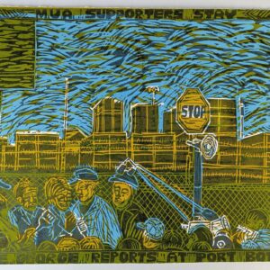 Sydney: Paula Bloch, 2001-2003.A complete set of Australian printmaker and activist Paula Bloch’s woodblock series inspired by her participatoin on the picket line at Port Botany during the 1998 Maritime Union of Australia dispute with Patrick Corporation and the Howard Government. The series documents the artist’s direct experience of one of the most significant industrial confrontations in modern Australian history, in which Patrick sought to sack its unionised workforce in an attempt to break the M.U.A. The complete series is here offered together with 2 variants and 2 original sketch concept drawings. Full list of items: 1. M.U.A. Here To Stay: Port Botany at the Picket Line. Signed and numbered colour woodblock. 2/5 dated 2001; 1b. Colour variant, unsigned; 1c. Original sketch concept drawing; 2. M.U.A. Supporters Stay: Jennie George Reports at Port Botany. Signed and dated 2003.; 2.b Original sketch concept drawing.; 3. Sydney Town Hall Square: Rally of Unionists and Supporters. Unsigned.; 4. Maritime Union of Australia: Protest Meeting at Darling Harbour.; 4b. Black and white variant.; 5. [MUA Here To Stay]. Smaller format: 31cm x 30cm, unsigned. Bloch, who fled Nazi Germany with her parents as a child, wrote of the dispute: “I escaped Hitlers Germany with my parents just before the war, and grew up with a strong commitment to peoples rights. The waterfront lock-out was such a shock – fascist tactics in Australia.” Her prints combine a personal political conviction with a formal language drawn from European protest graphics and the screenprint traditions of the 1970s Tin Sheds poster workshops. Four of the five prints are held in the National Library of Australia (the present third print, Sydney Town Hall Square, apparently unrecorded.)