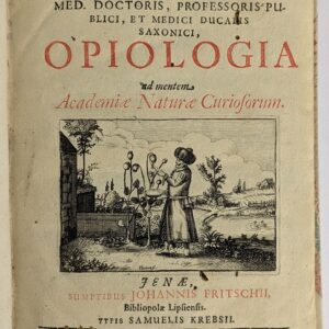 Jenae: Johannis Fritschii, 1674.First edition of this rare and early treatise on the pharmacological and therapeutic aspects of opium. The large title vignette one of the earliest illustrations of scoring and bleeding the poppy. Georg Wolfgang Wedel (1645-1721) was a German professor of surgery, botany, theoretical and practical medicine, and chemistry.