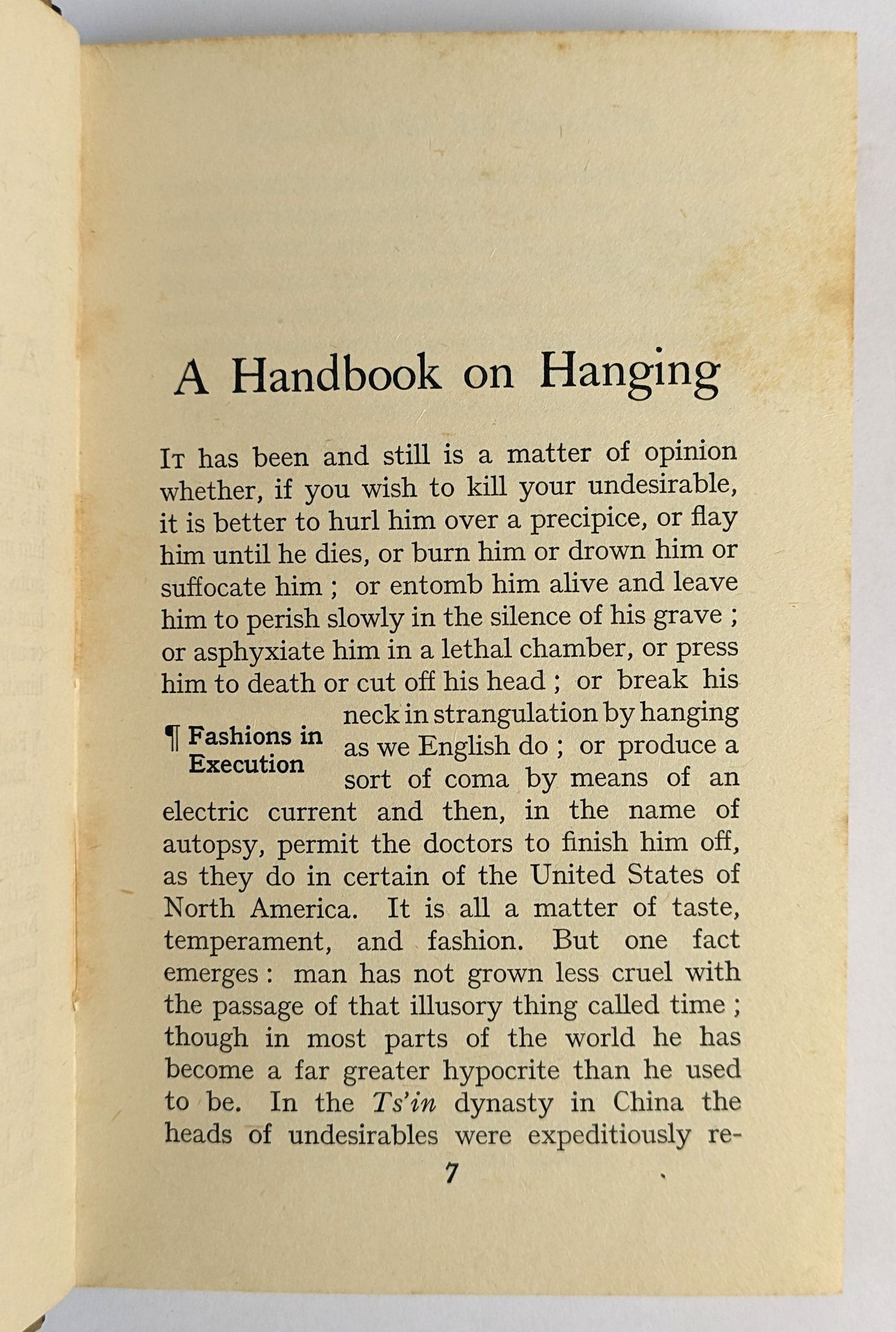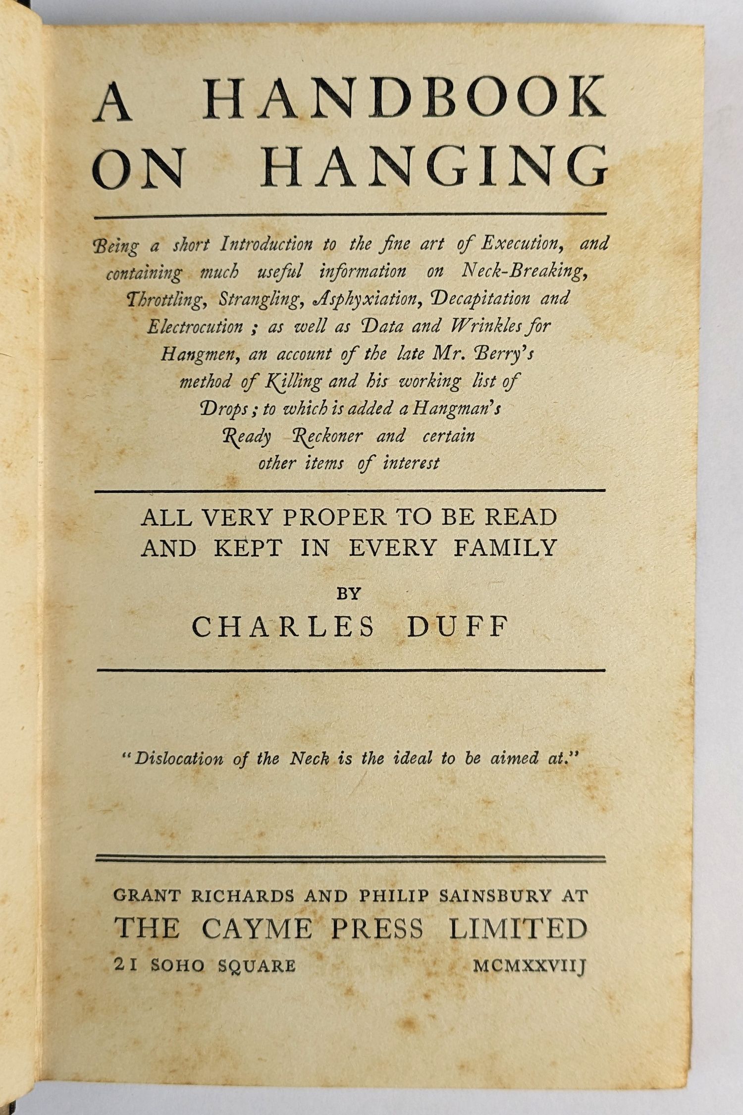 Capital punishment in Britain. Being a short Introduction to the fine art of Execution, and containing much useful information on Neck-Breaking, Throttling, Strangling, Asphyixiation, Decapitation and Electrocution; as well as Data and Wrinkles for Hangmen, an account of the late Mr. Berry’s method of Killing and his working list of Drops; to which is added a Hangman’s Ready Reckoner and certain other items of interest. This copy with the bookplate of Alan Queale by N. S.