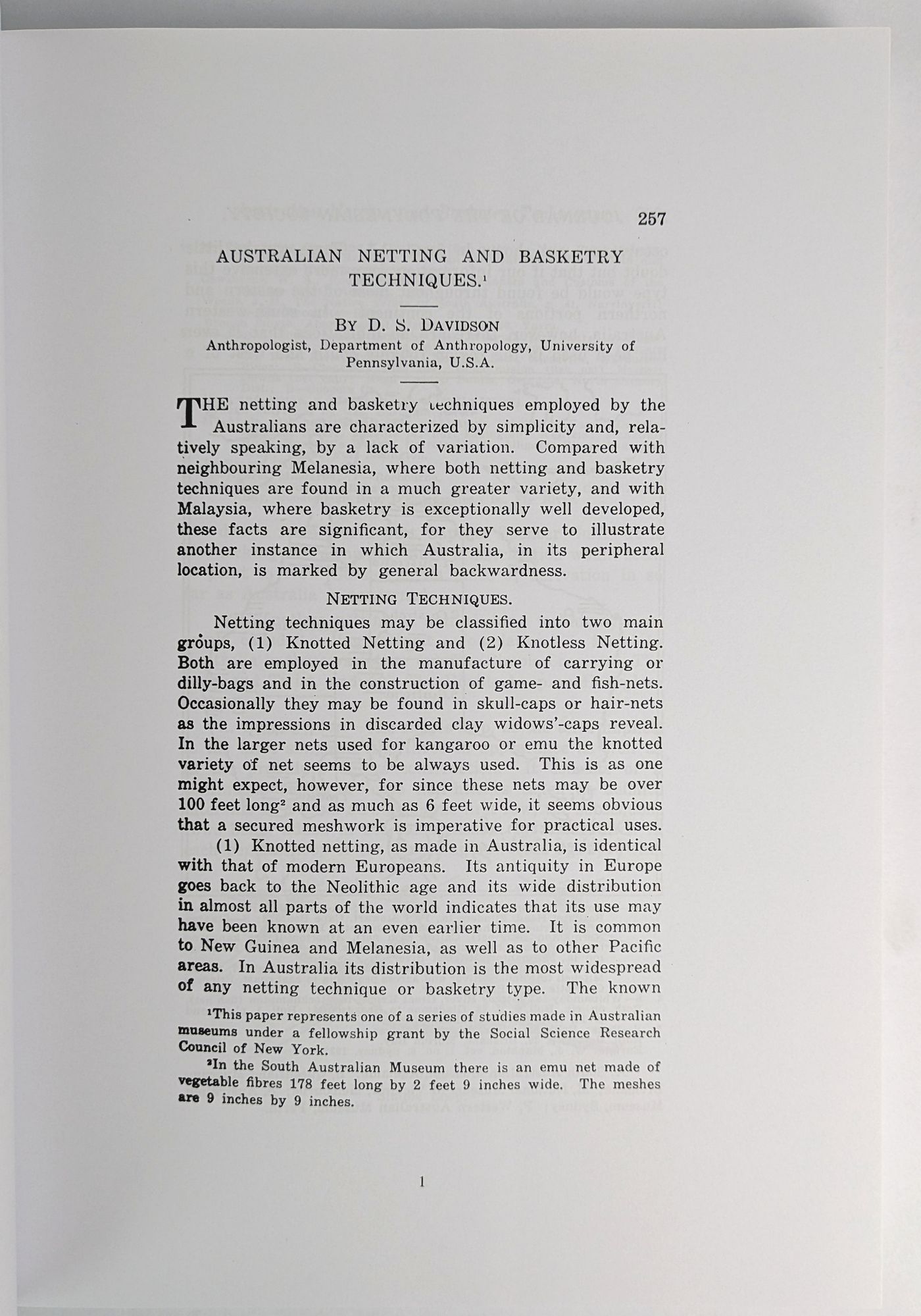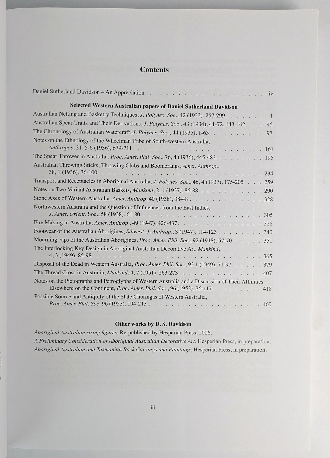 Reproduces the majority of Davidsons Australian ethnographic papers from 1933 to 1953 in facsimile. Topics covered include Aboriginal Axes, Spears, Clubs, Canoes, Baskets, Boomerangs, Petroglyphs, Key Designs, Waningas, Churingas, Fire, Footwear and Death.