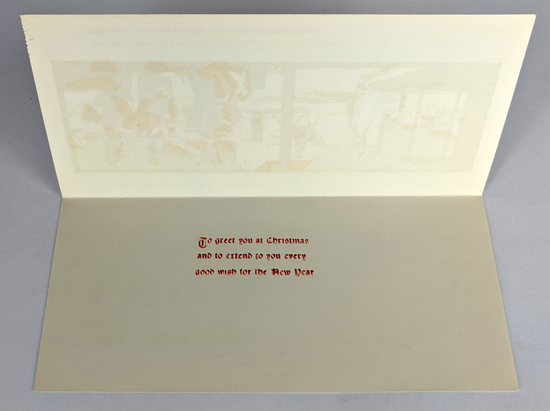 One in a series of wood engraved Christmas cards produced by Kenneth Wallace-Crabbe at his Melbourne studio in the 1960s/early 1970s under the heading of Australian Retrospect. This card depicts a group of soldiers singing in the street in Sydney. The caption reads: “1808. OUR FIRST TROOPS. Men of the New South Wales Regiment, (‘The Rum Corps’) sing anti-Bligh songs in George Street, Sydney.” The interior contains a short printed Christmas greeting and his studio details printed on the verso.