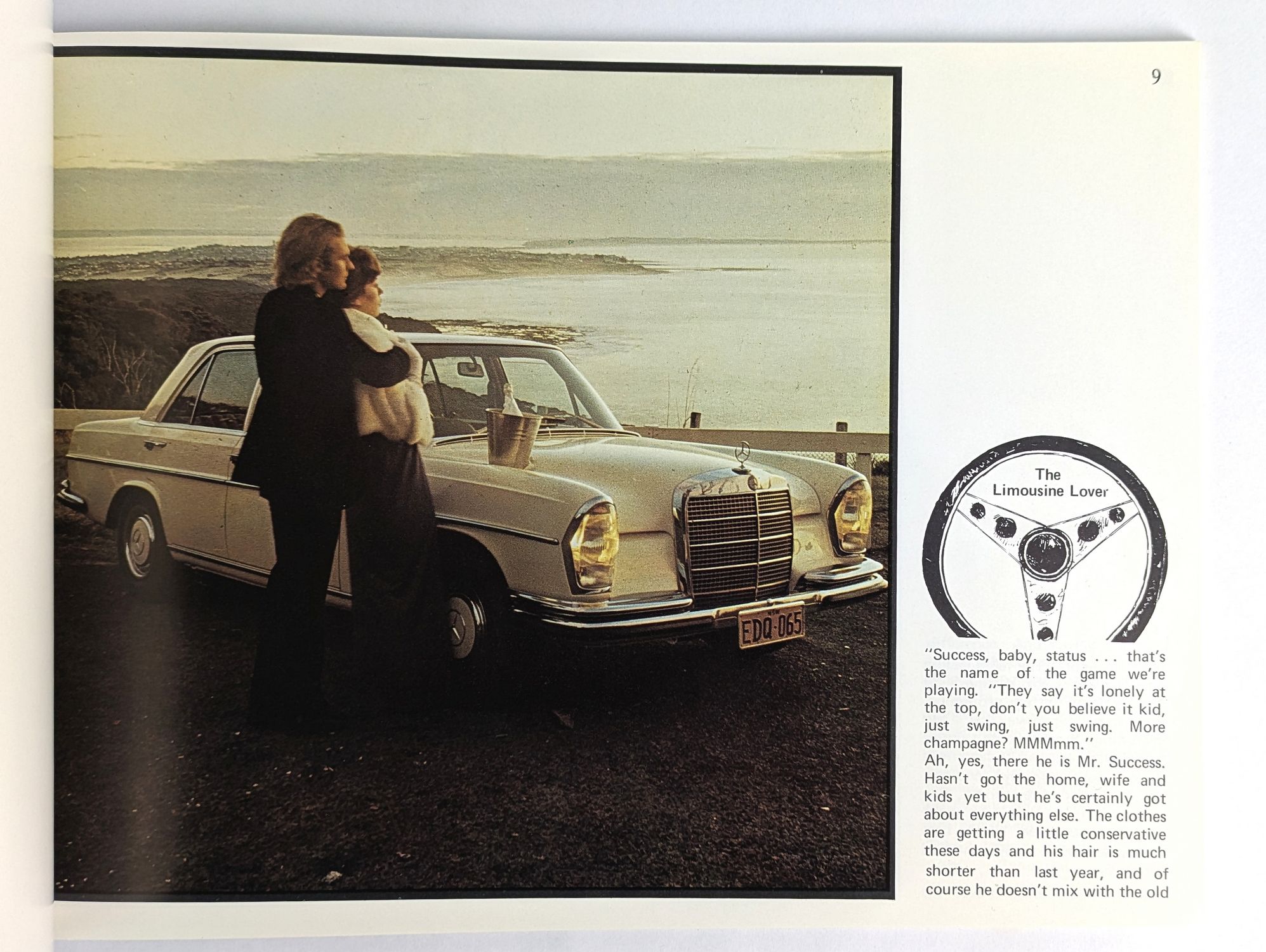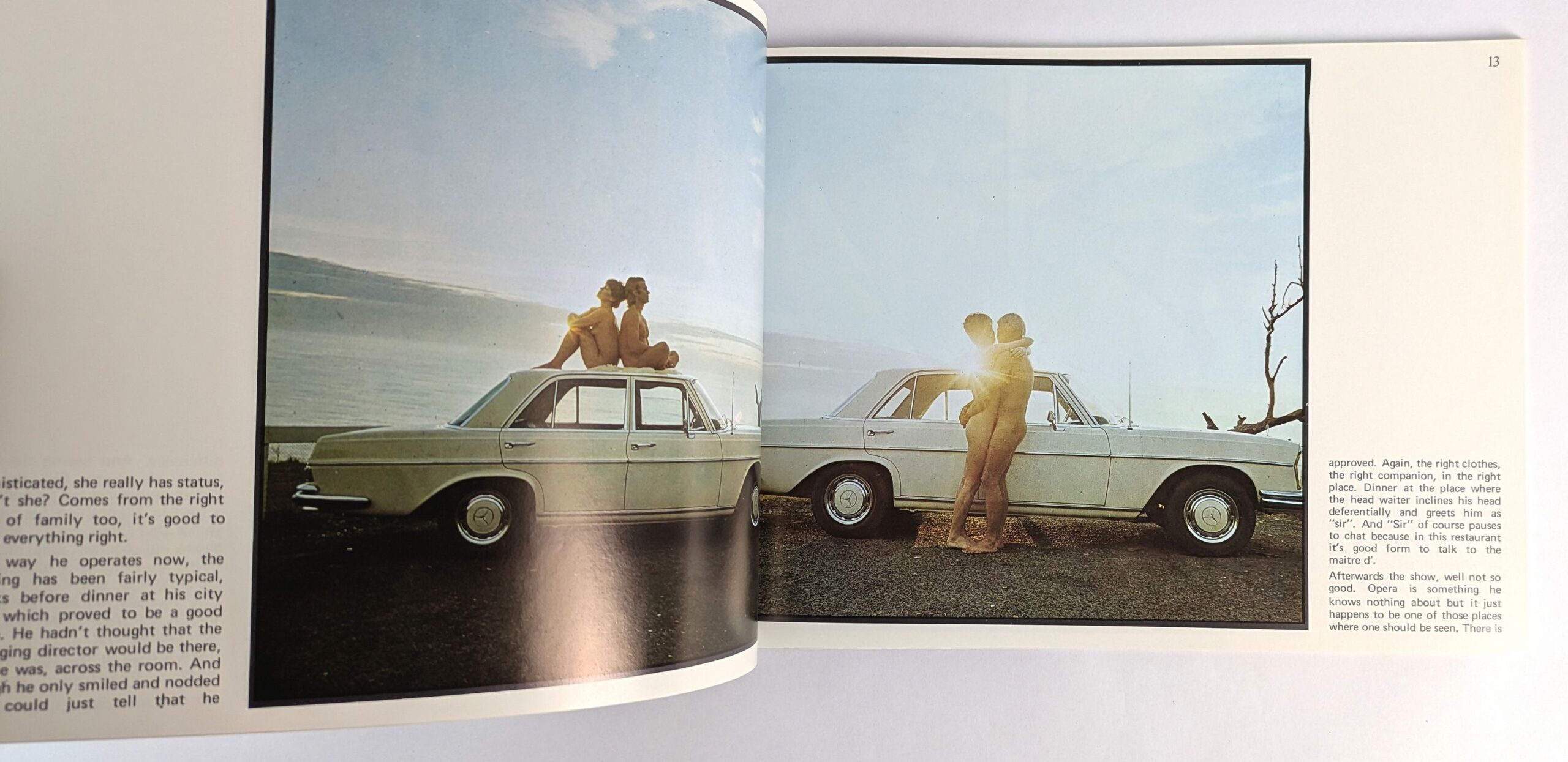 The high point of Howard Publications 1970s Australian erotica output, a fully illustrated exploration of the car’s influence on man’s sexual behaviour. Lengthy text by Adina Yurana accompanies five photographic series of couples making love in and on their cars in Australia’s great outdoors. Featuring a Mercedes-Benz 280C (The Limousine Lover), a Ford Falcon 500 (The Countryman), a Nissan Patrol (The Great White Hunter), and a Meyers Manx dune buggy (Beachbuggy).