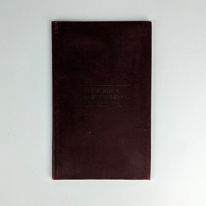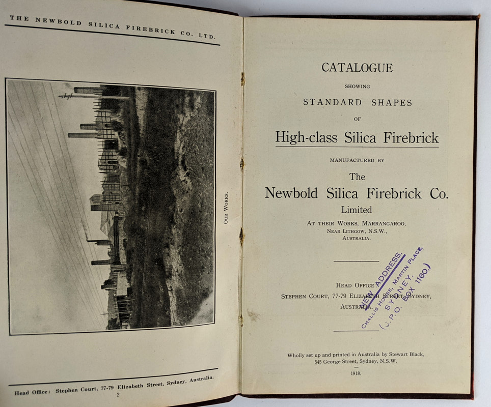Manufactured by The Newbold Silica Firebrick Co. Limited at their works, Marrangaroo, near Lithgow, N.S.W., Australia. Numerous illustrations of brick shapes, photographs of the factory, and facsimiles of testimonial letters. Established in 1912 by Arthur Roger Newbold, The Newbold Silica Firebrick Co. operated from Marrangaroo until 1918 when operations were moved to Newcastle, placing the production of this catalogue in early 1918, before the move, though with later distribution as it bears a stamp with an updated head office address. In 1946 the firm was renamed Newbold General Refractories Ltd. and was acquired by BHP in 1974. Rare, unrecorded in Trove.