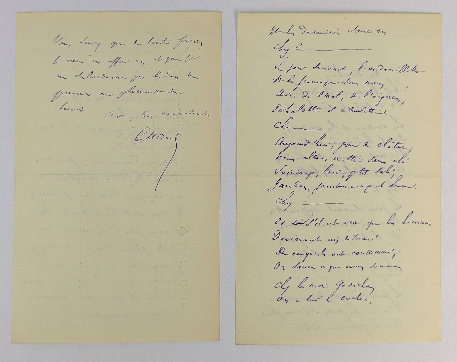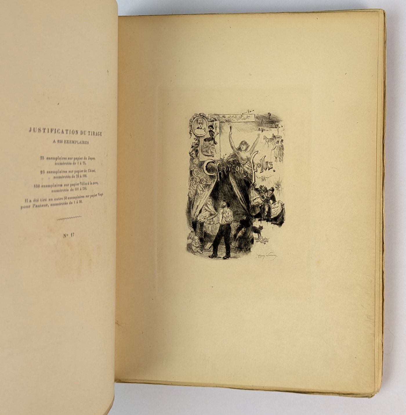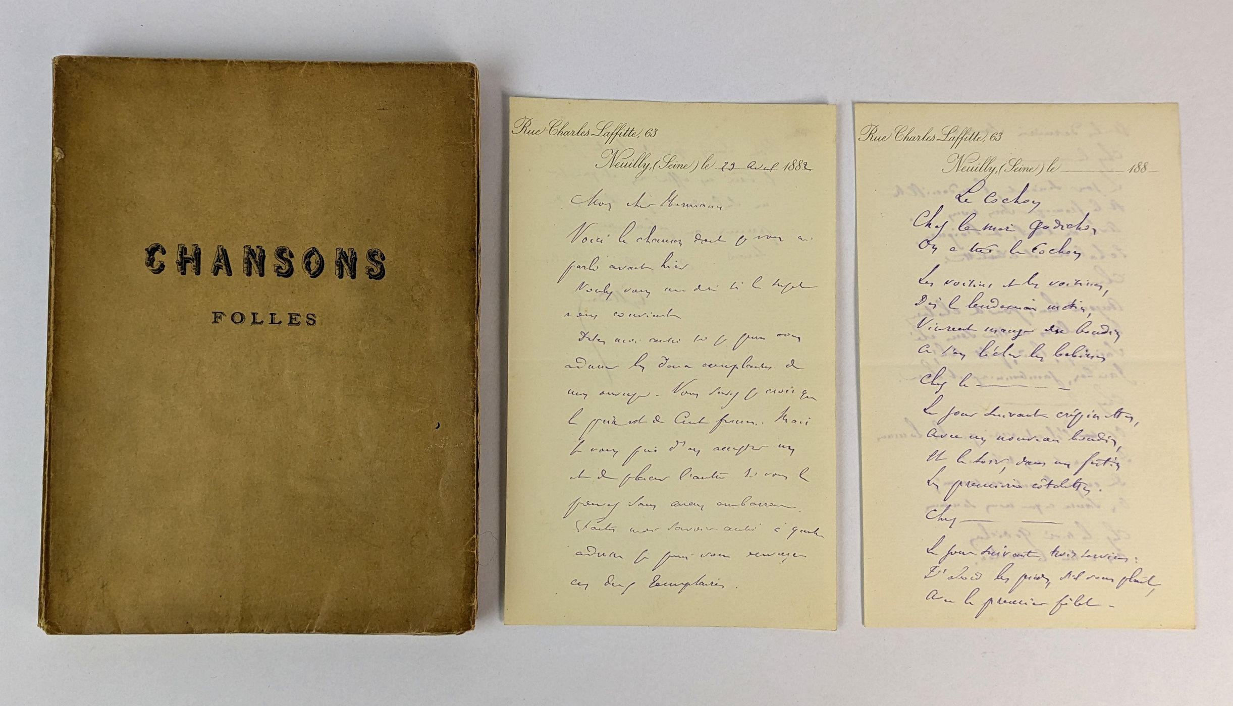 Collection of 41 erotic songs with musical score by Gustave Nadaud and published anonymously with a fine frontispiece engraving by Henry Somm. One of 75 numbered copies on Japon (of a total edition of 300). This copy with a two-page signed letter by the author in purple ink dated 29 Avril 1882, written on nice stationery that features the letterhead Rue Charles Laffitte, 63, Neuilly, (Seine); and a two-page song composed on the same stationery in the same purple ink.