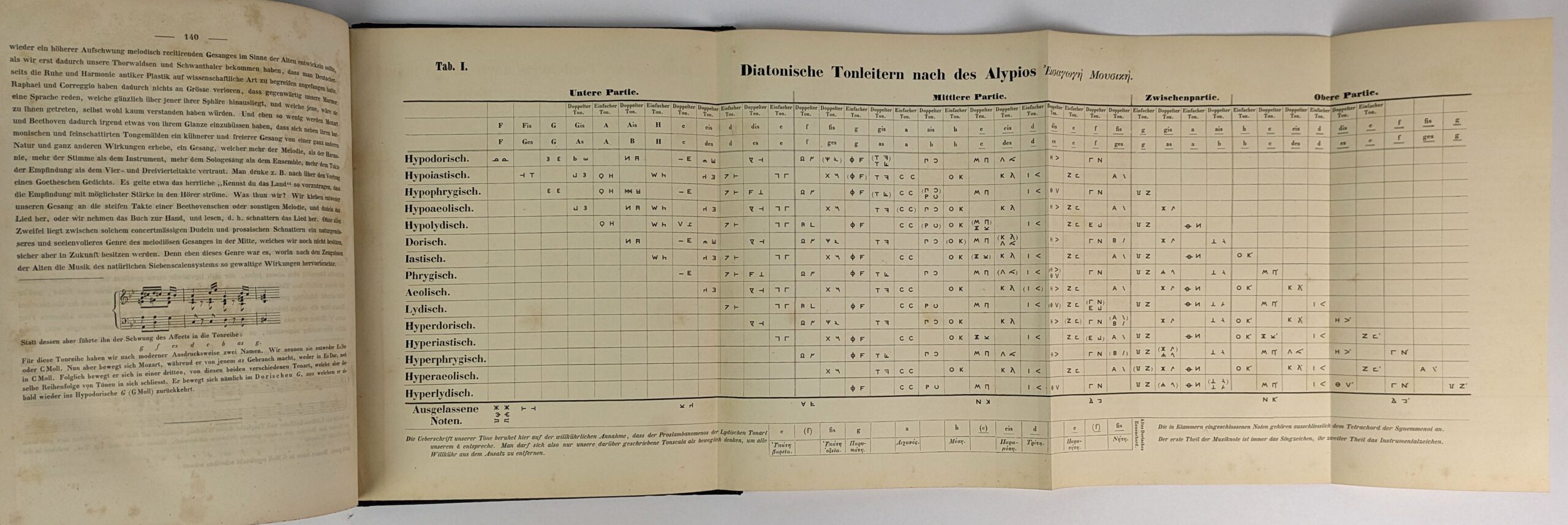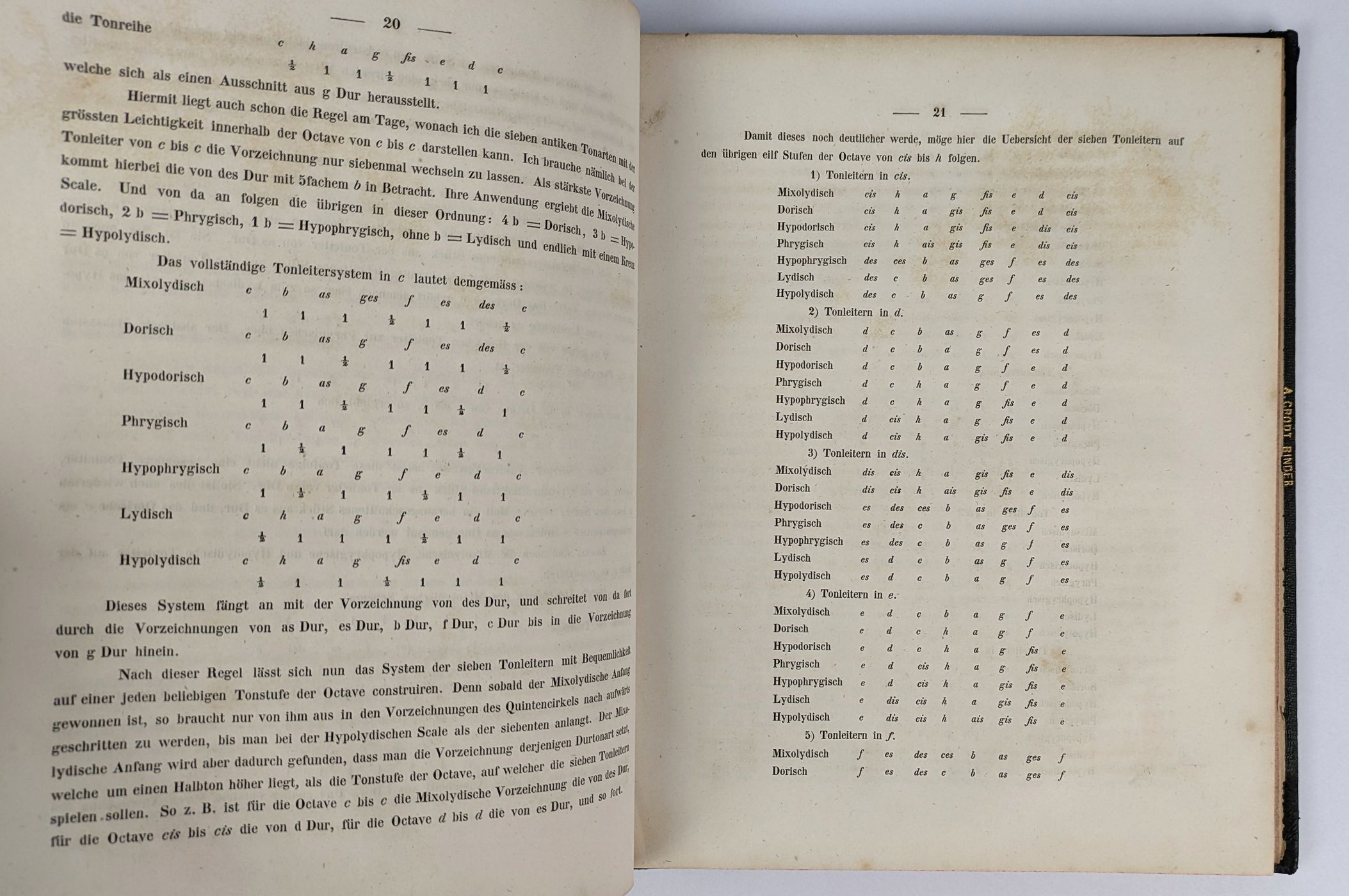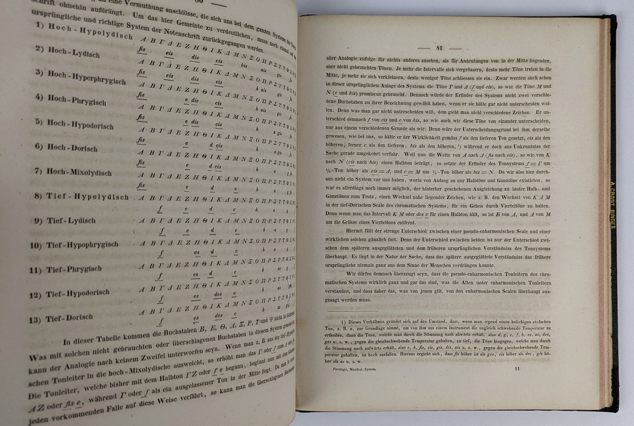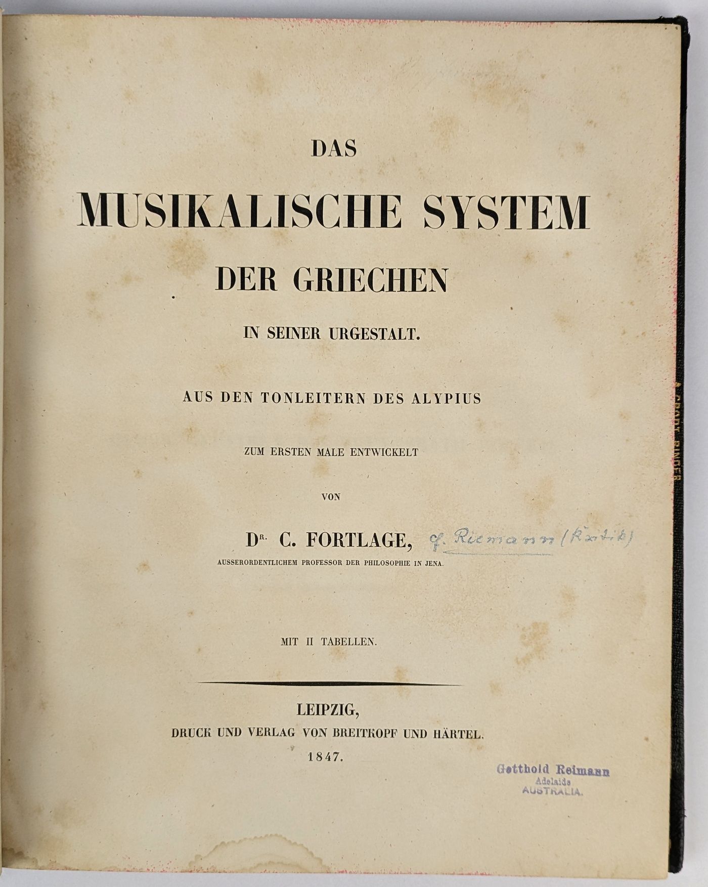 Aus den Tonleitern des Alypius zum ersten male entwickelt von Dr. C. Fortlage, Ausserordentlichem Professor der Philosophie in Jena. Mit II Tabellen. [The Musical System of the Greeks in its Original Form. Developed for the first time from the scales of Alypius]. This copy with the stamp of musician Immanuel Gotthold Reimann (1859-1932), founder of the Adelaide College of Music.