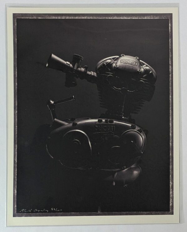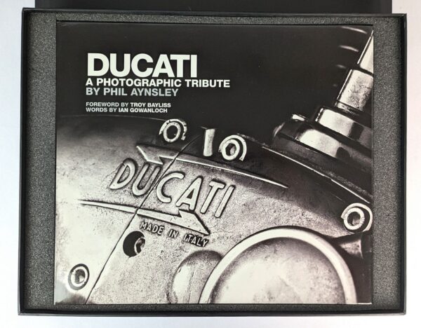 Limited Edition box set, being 1 of 100 copies with 3 silver gelatin photographs signed and numbered by the photographer together with a signed and numbered certificate, and signed and numbered copy of the book which is also signed by 3 time World Superbike champion Troy Bayliss, housed together in a custom box. A pictorial tribute to the Ducati motorcycle by Australian photographer Phil Aynsley.