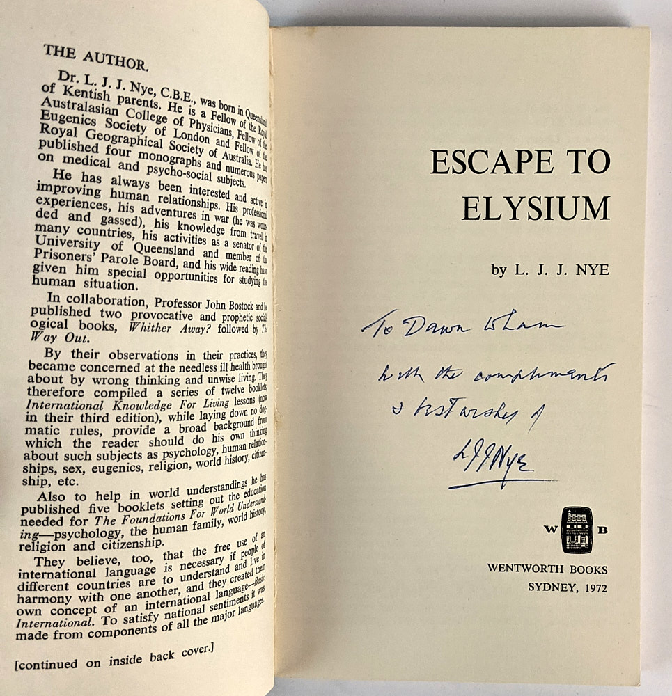 Australian utopian literature by Queensland doctor Leslie John Jarvis Nye (1896-1976). This copy inscribed by Nye.