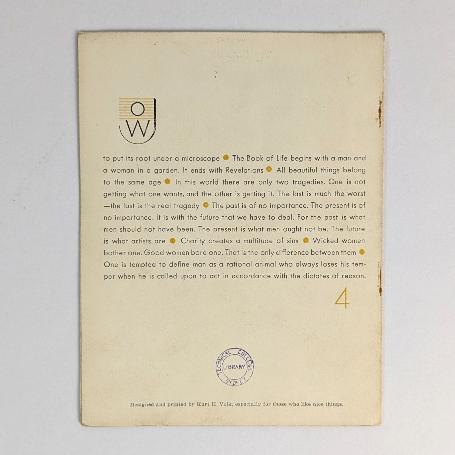 A rare piece of Wildeana, being a collection of aphorisms, designed and printed by German-American typographer Kurt H. Volk (1883-1962). Unrecorded in OCLC.