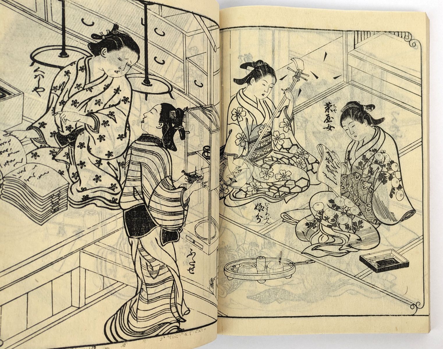 One of the masterpieces of Ukiyoe art. Depicts women from various social classes of the Edo period, from court and samurai ladies to geisha and sex workers, and the many town and country women in between. Originally published in 2 volumes in 1723 and here reprinted together in 1 volume circa late 19th/early 20th century.