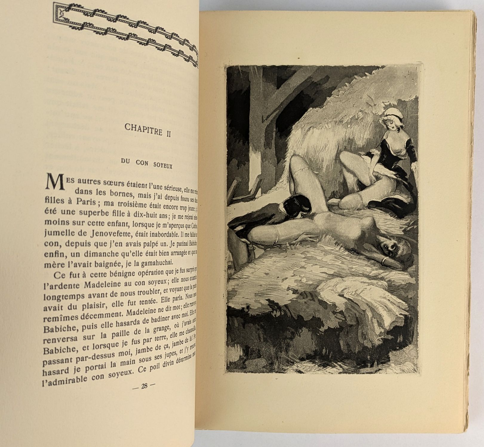 The Anti-Justine, or the Delights of Love. New edition, entirely revised and corrected, established for the first time on the original text of 1798. Preceded by a Bibliographic Notice by Helpey, bibliophile from Poitou [Louis Perceau] The second clandestine printing by Maurice Duflou with 12 aquatints reproduced in heliogravure signed Le Loup. Numbered edition of 350 copies on Alfax, of which this is number 345. DUTEL 1024. PIA 71.
