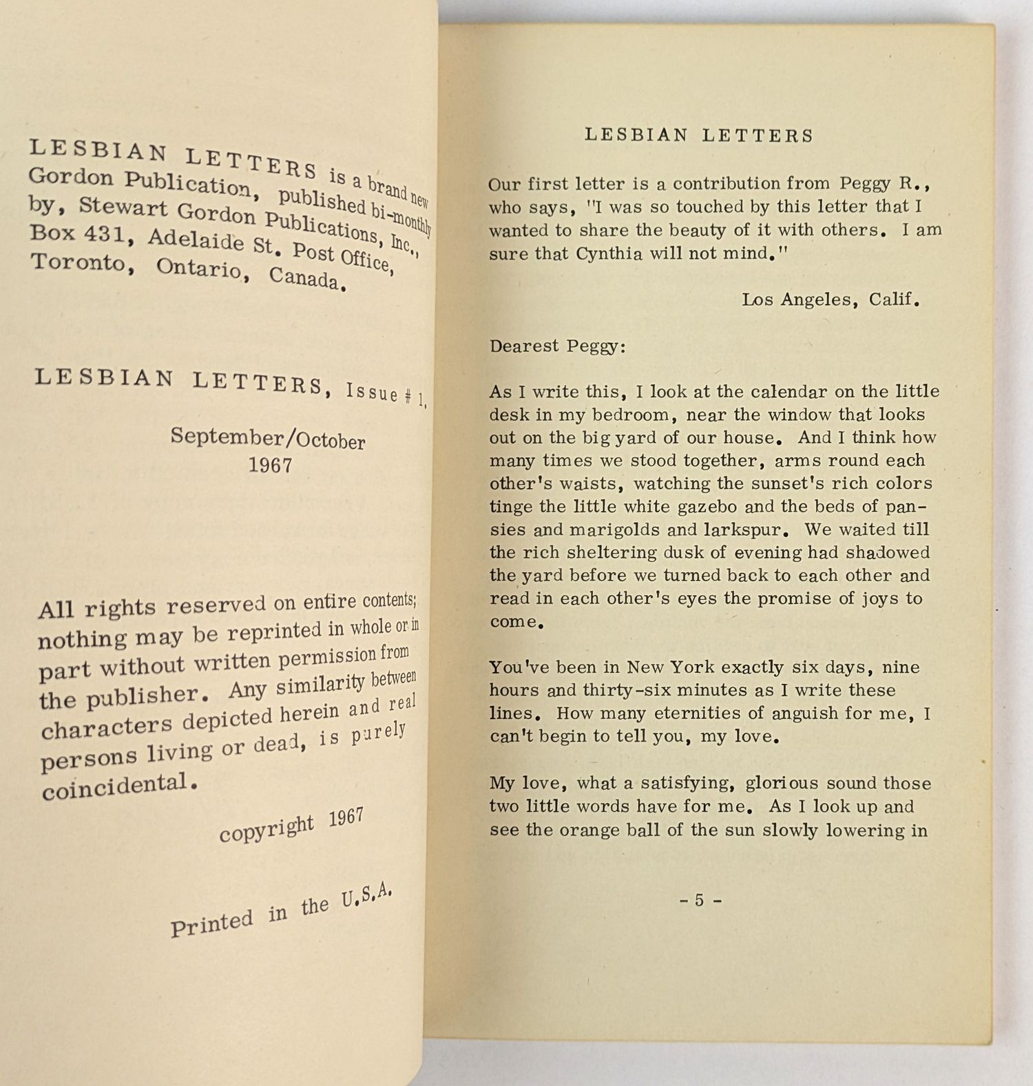 Pre-Stonewall lesbian periodical (complete in two parts) published under the pseudonymous editorship of “Hera,” comprising confessional-style narratives presented as authentic letters from lesbian correspondents. Includes purportedly authentic but likely fictionalised first-person accounts of lesbian desire, seduction, and relationships, alongside an advice column attributed to “Dr. G. Klow.” Published by Stewart Gordon Publications, a Toronto and New York erotica house also responsible for editions of de Sade. The publication follows the conventions of 1960s commercial sleaze, with pseudonymous authorship and a thin clinical veneer. A relatively refined example of sensationalist lesbian-themed print culture, adopting a more polished tone while remaining within the conventions of male-oriented commercial erotica.