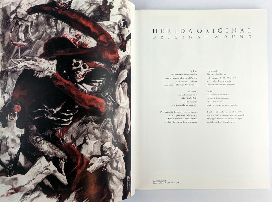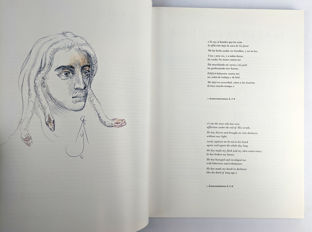 The first monograph collecting a wide range of works of Argentine symbolist and surreal artist Santiago Caruso (1982-). Materia Oscura documents the best works he produced between 2002 and 2017. Includes a short introduction by Enrique Alcatena, a short biography, and an essay and poems by the artist in both English and Spanish. This copy signed with an original drawing of a head with snake hair.
