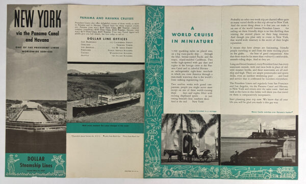 Timetable and fares for cruises on the Dollar Steamship Line in Ships named after American presidents. May 15, 1937 issue.