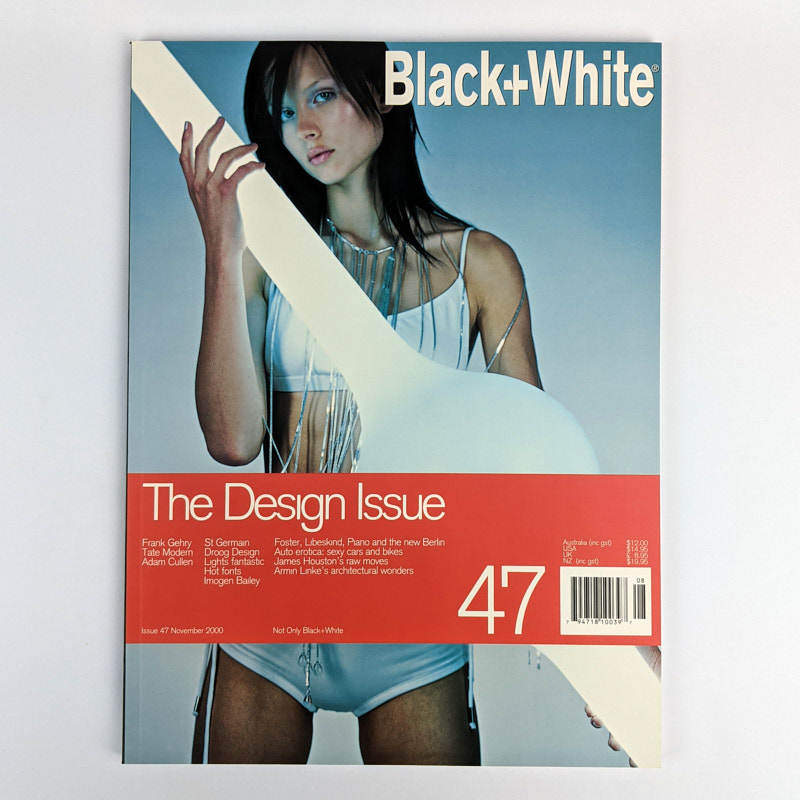 Single issue of successful Australian photography magazine, (not only) Black+White. Published between 1992 and 2007 Black+White was a coffee table format magazine which featured work from some of the world’s top photographers, often nude or semi-nude portraiture, together with interviews with photographers and celebrities and articles on popular culture and current events. In this issue: The Design Issue: Frank Gehry, Tate Modern, Adam Cullen, St Germain, Droog Design, Lights Fantastic, Hot Fonts, Imogen Bailey, Foster, Libeskind, Piano and the new Berlin, Auto Erotica: Sexy Cards and Bikes, James Houston’s Raw Moves, Armin Linke’s Architectural Wonders.