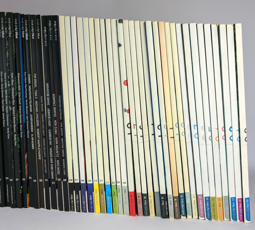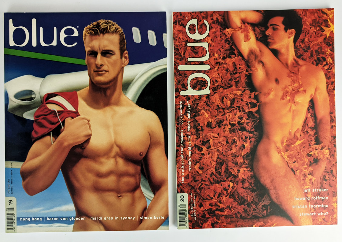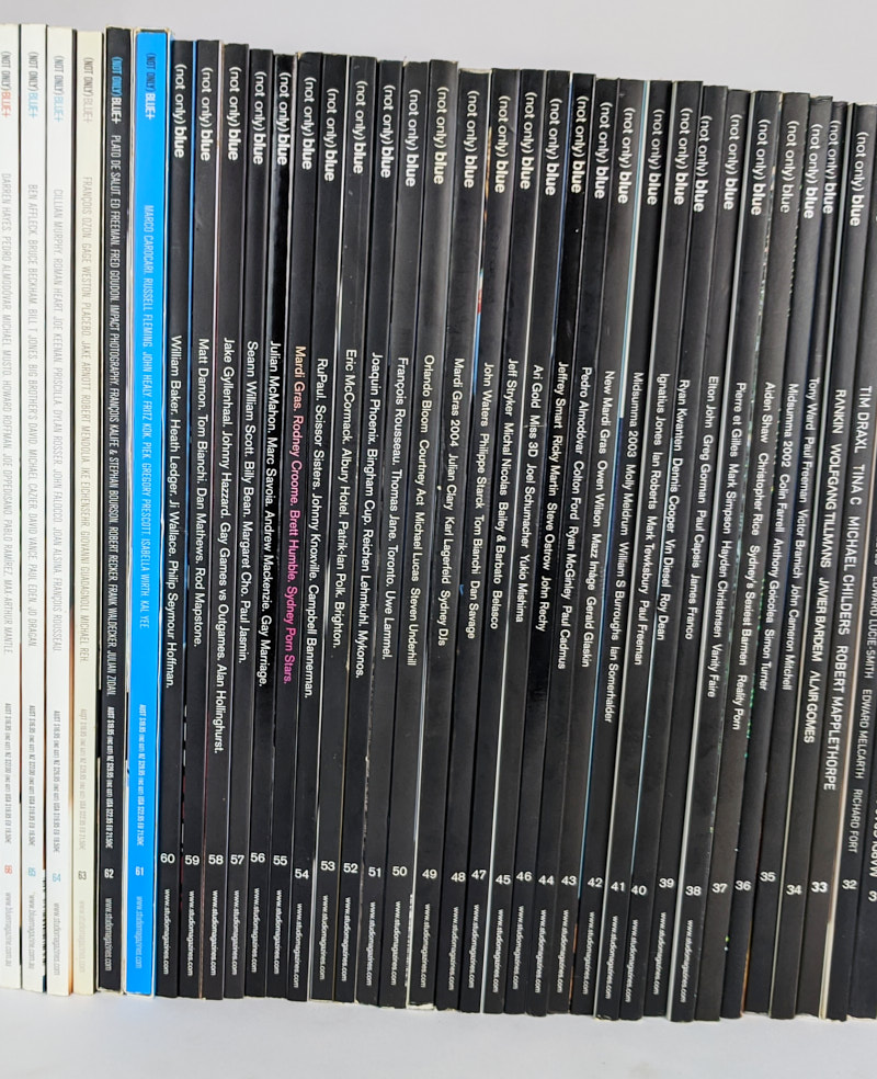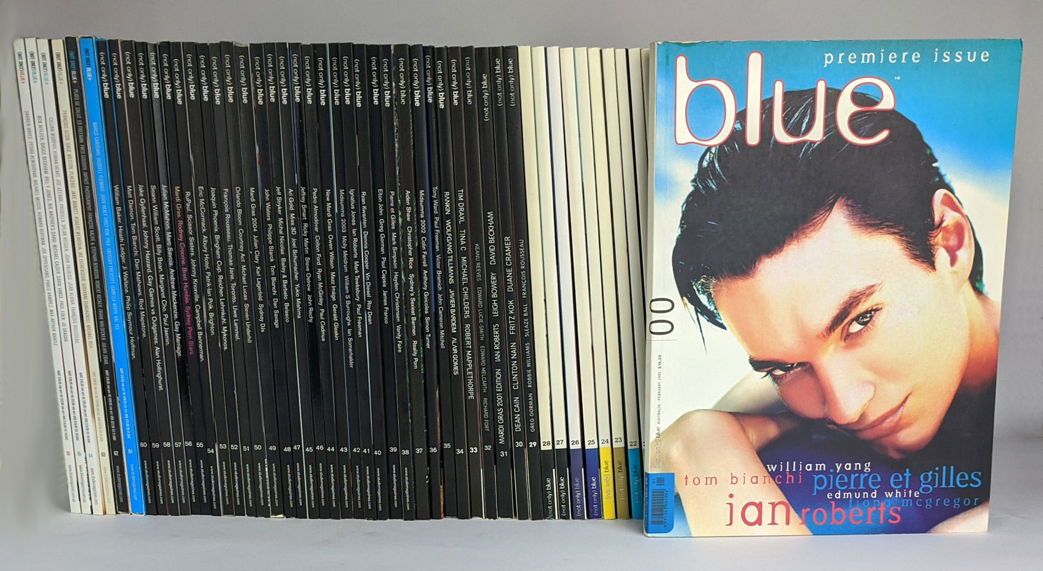 A complete set of Australian gay men’s magazine, (not only) Blue, from issue 00 to 66 (67 total). Blue was a glossy coffee table art magazine produced between 1995 and 2007 by Studio Magazines in Sydney, who also published the successful photography magazine, Black+White. “Blue’s agenda is to showcase artists whose work is an authentic representation of gay relationships, gay lifestyles and gay issues” (Blue’s editorial statement) and it did so in a large format filled with nude and semi nude art photography. The premiere issue featured William Yang, Tom Bianchi, Pierre et Gilles, Edmund White, Fiona McGregor, and Ian Roberts, and over its 12 year history featured work from top photographers and features on artists and celebrities including Robert Mapplethorpe, Leigh Bowery, Boy George, Erwin Olaf, k.d. lang, Bruce of LA, Dennis Rodman, Elton John, John Waters, Karl Lagerfield, Jeffrey Smart, Yukio Mishima, Paul Cadmas, William S. Burroughs, George Platt Lynes, Gilbert and George, Rupert Everett, Uma Thurman, Wilhelm von Gloeden and countless others. International buyers please contact for shipping quote.