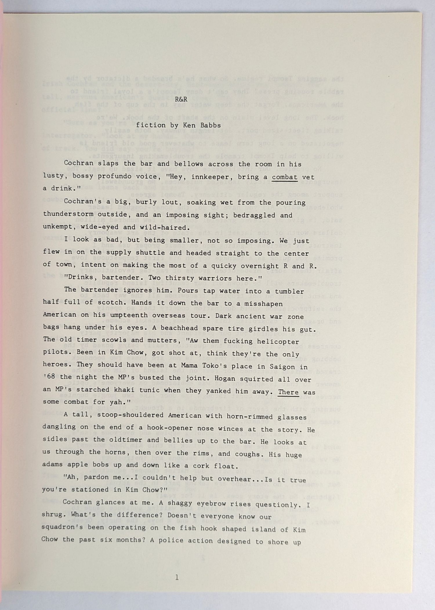 Self-published short story by Merry Prankster and psychedelic icon Ken Babbs, featuring Marine helicopter pilots Huckelbee and Cochran on R&R at a Japanese brothel, the Five Hundred Club. An early version of what would become, in heavily edited form, chapter 7 of Babbs’ 2011 Vietnam novel, Who Shot the Water Buffalo?. The novel originated from a manuscript Babbs began during his service as a Marine helicopter pilot in Vietnam (1962-63) and took nearly fifty years to reach publication. The present pamphlet is the only known separate printing of any portion of that manuscript, preserving a pre-publication text substantially different from the finished novel. Inscribed by Babbs to counterculture collector and historian Rick Synchef. Unrecorded in OCLC.