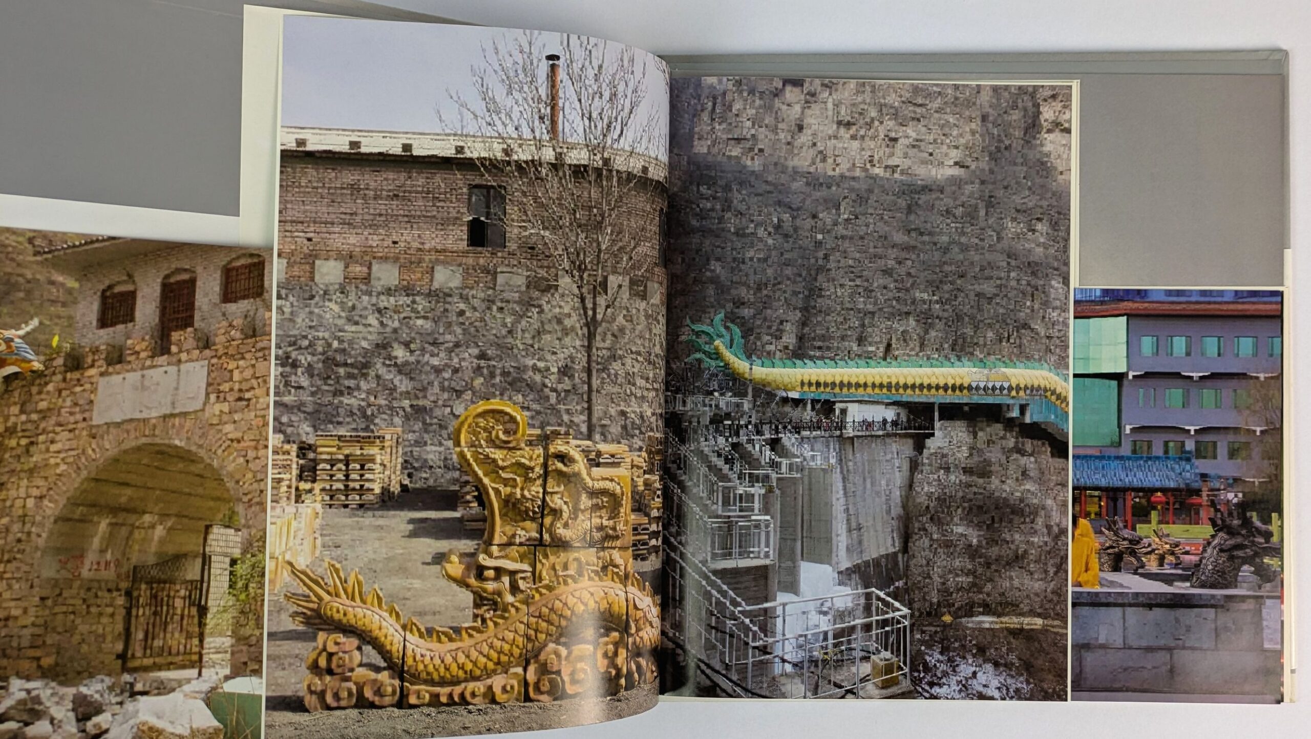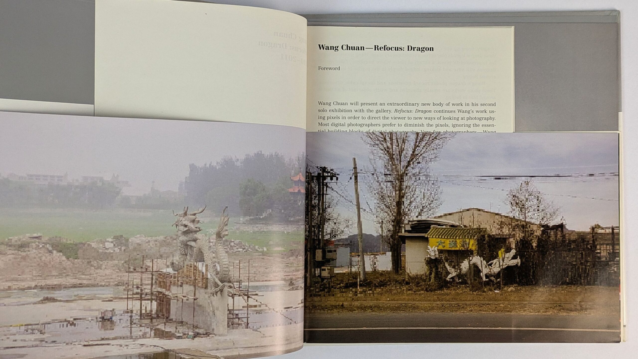 “Published on the occasion of Wang Chuan’s second solo exhibition ‘Refocus: Dragon’ at Pekin Fine Arts, Beijing, April to May 2011. This exhibition is also part of Caochangdi Photospring 2011. Wang takes a contrarian approach to digital photography by enlarging the pixels and making them obvious to the viewer in order to draw attention to overlooked details of Beijing’s landscape. ‘In Refocus: Dragon, Wang demonstrates a simple enough premise: The dragon is still everywhere in Beijing; its portrait shows up in the oddest and most unexpected places.[…] Wang’s works implicitly question how these dragon legends play out on a contemporary stage. Wang shows us, using his impressionistic pixels, a variety of places where he recently “discovered” dragons still alive and kicking, lodged deeply in the psyche of local people around Beijing.’ (from foreword by Meg Maggio) Includes an essay by Gu Zheng and artist statement by Wang Chuan. Artist biography and list of works provided. Chinese text is printed in a separate booklet attached.” (publisher’s blurb). This copy inscribed by the photographer.