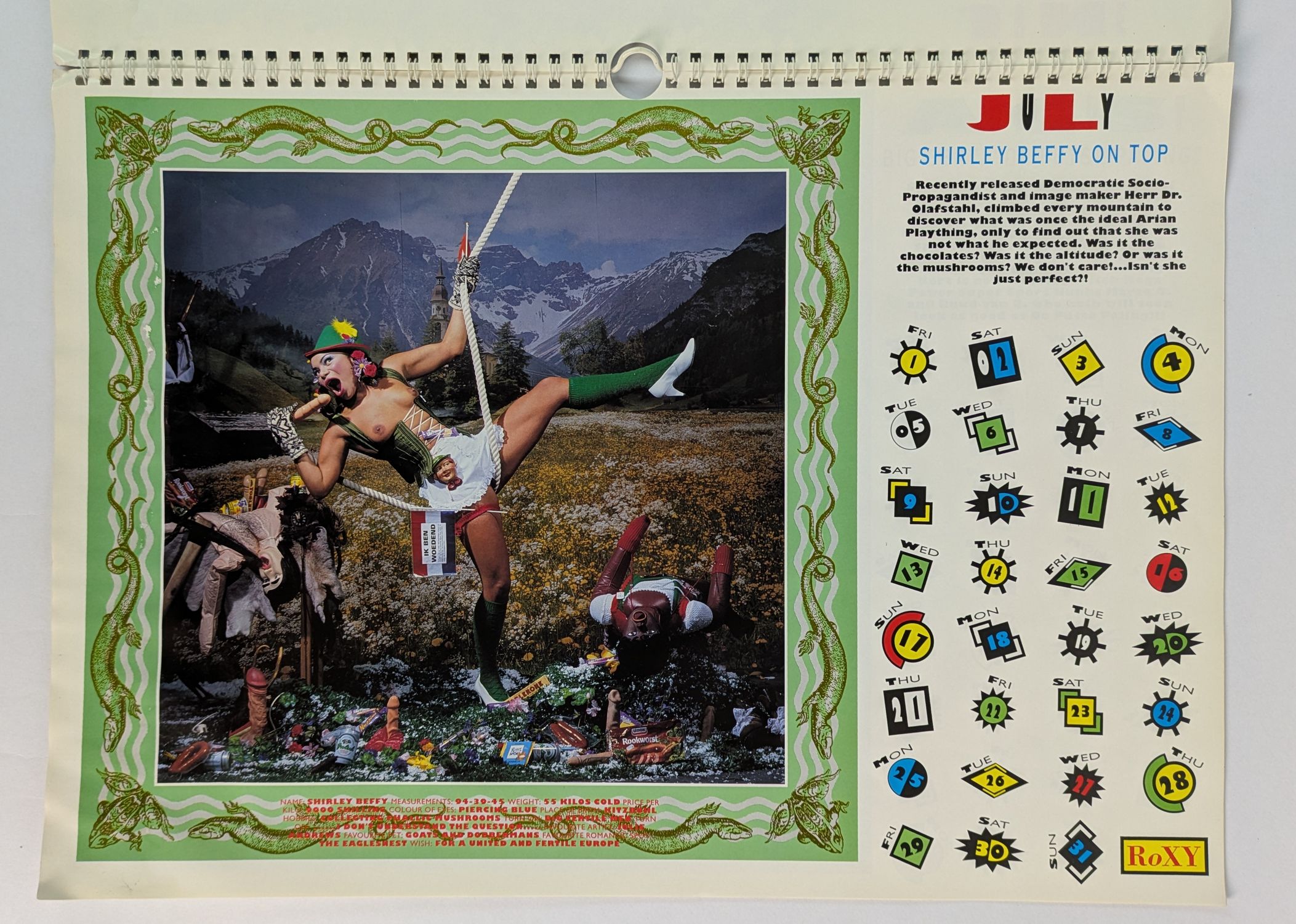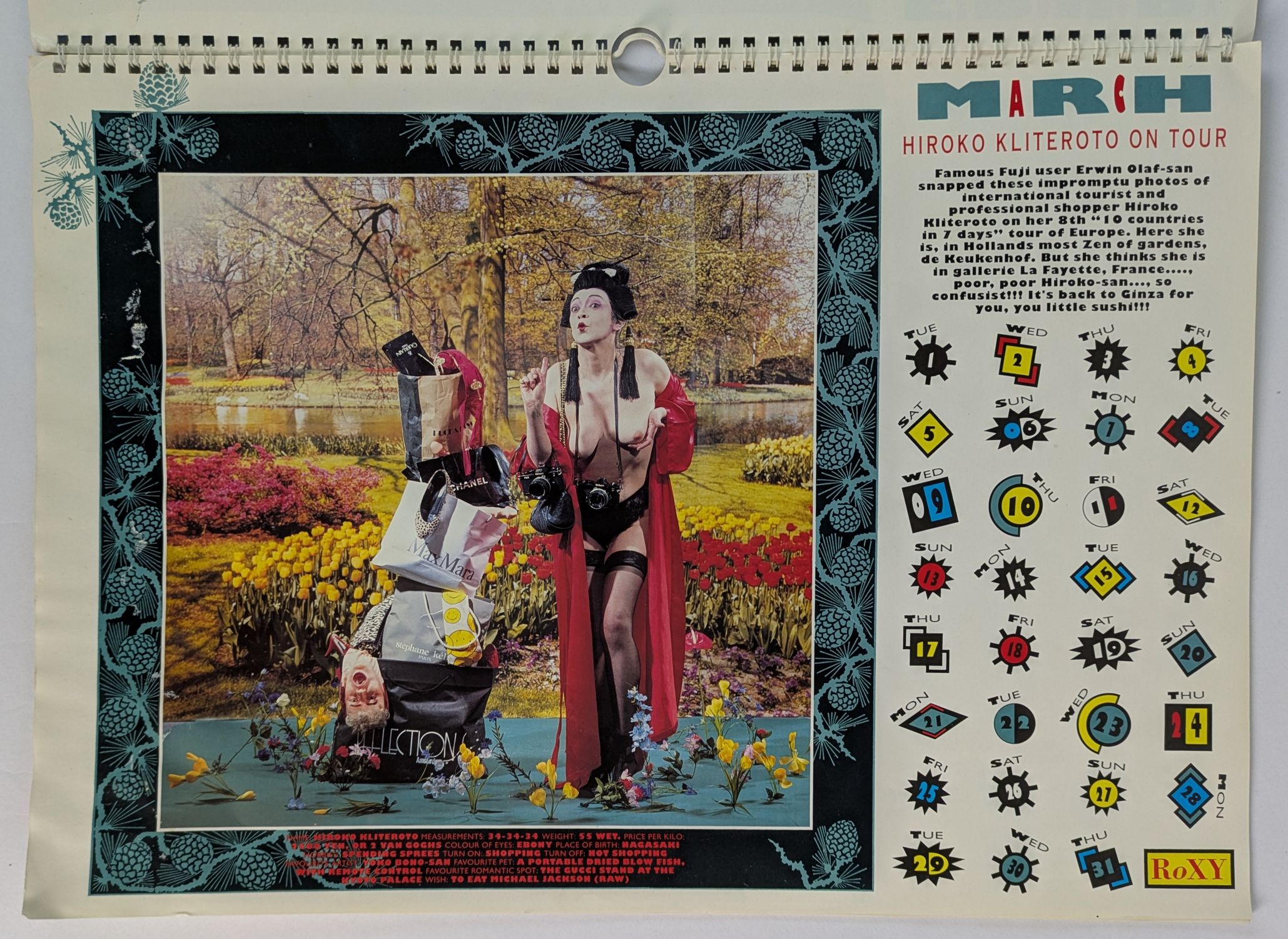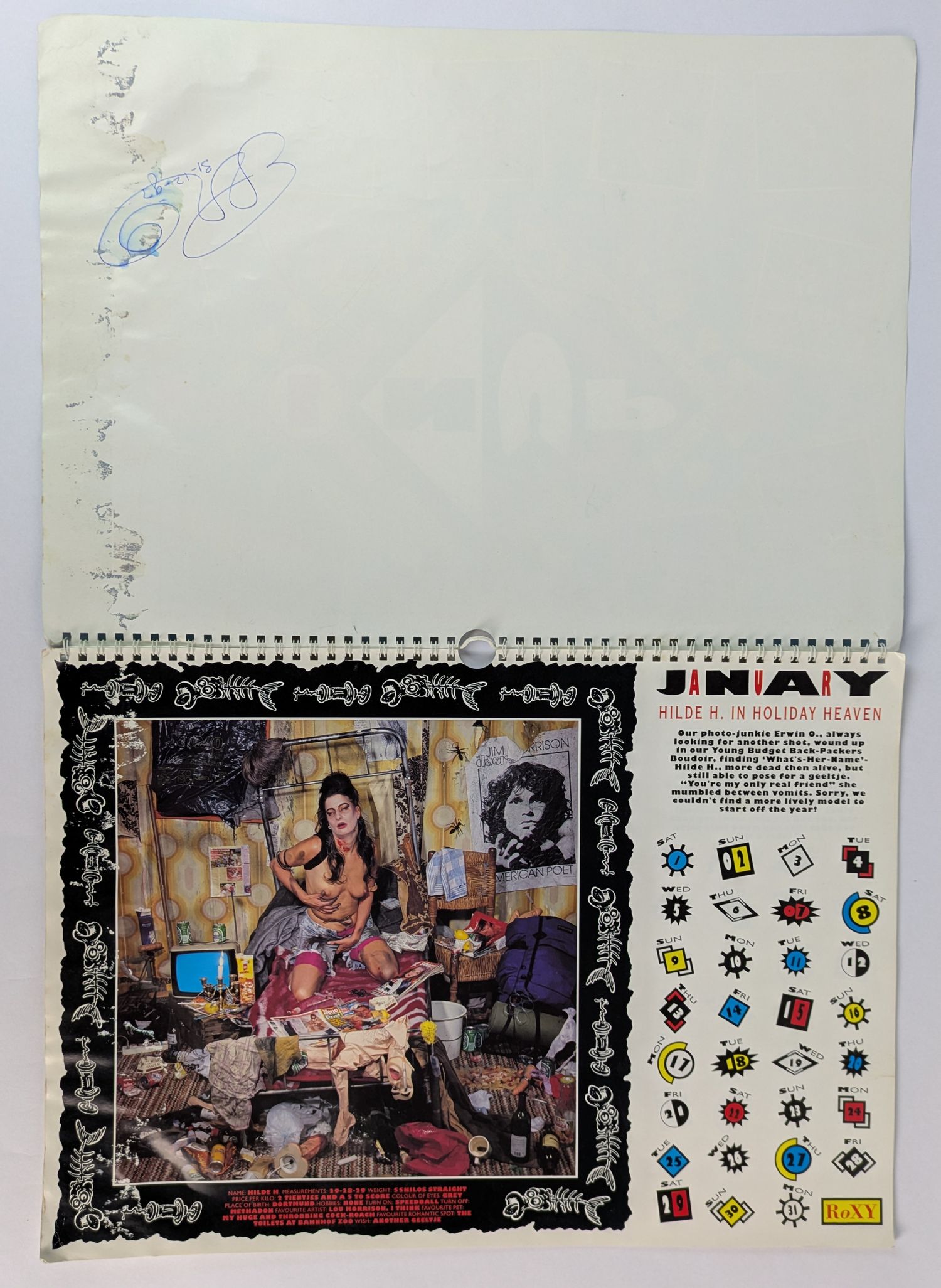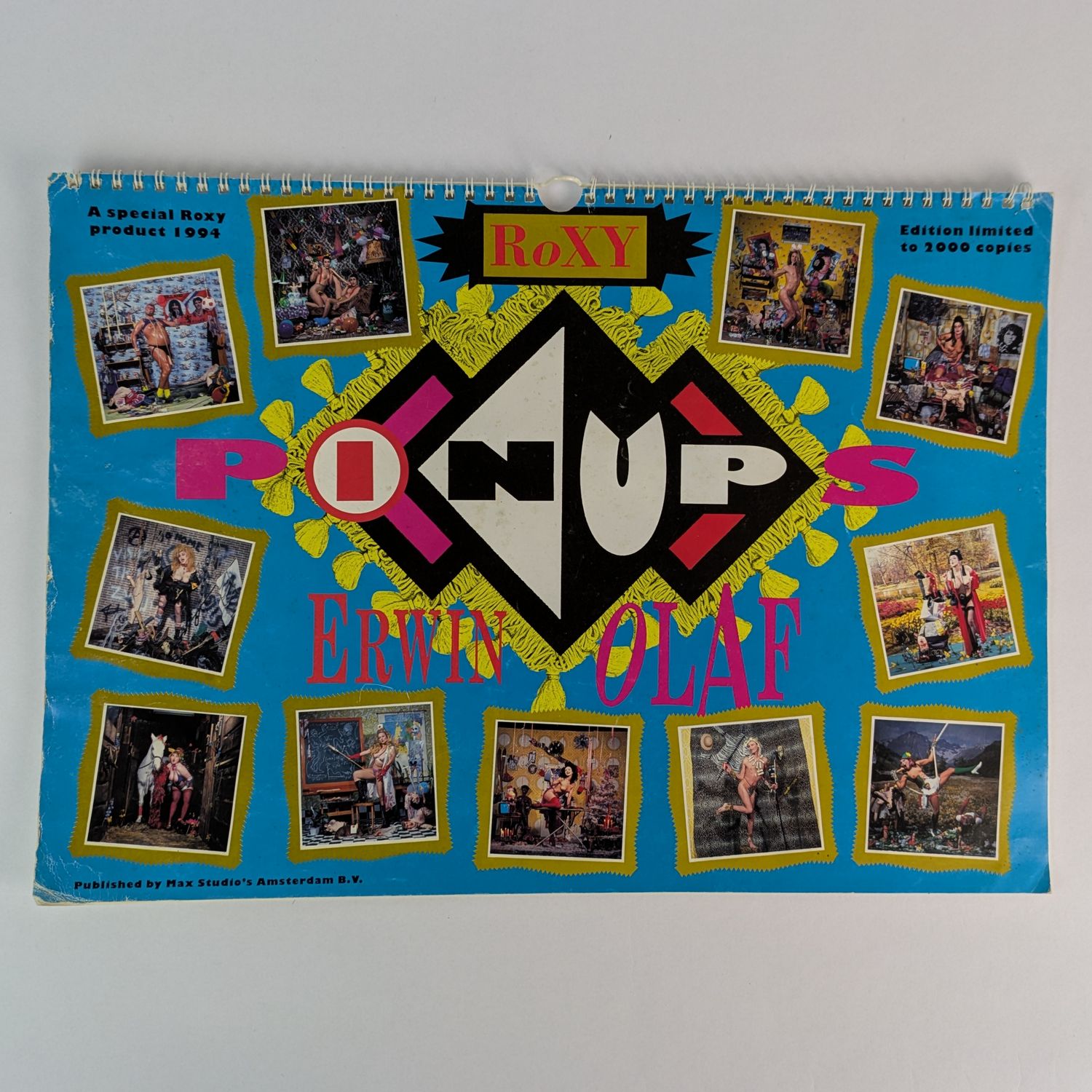 1994 calendar for the Amsterdam club RoXY. Operating from 1987-1999, RoXY (Radical outlet for the Xenomaniac in You) was a rave club emerging at the beginnings of rave culture. Known for its theatrical and glamorous atmosphere, which is on show here with 13 elaborately staged portraits by Dutch photographer Erwin Olaf. This copy signed by Olaf.