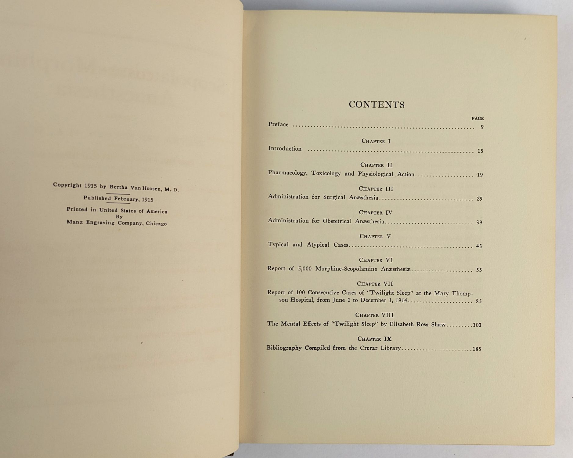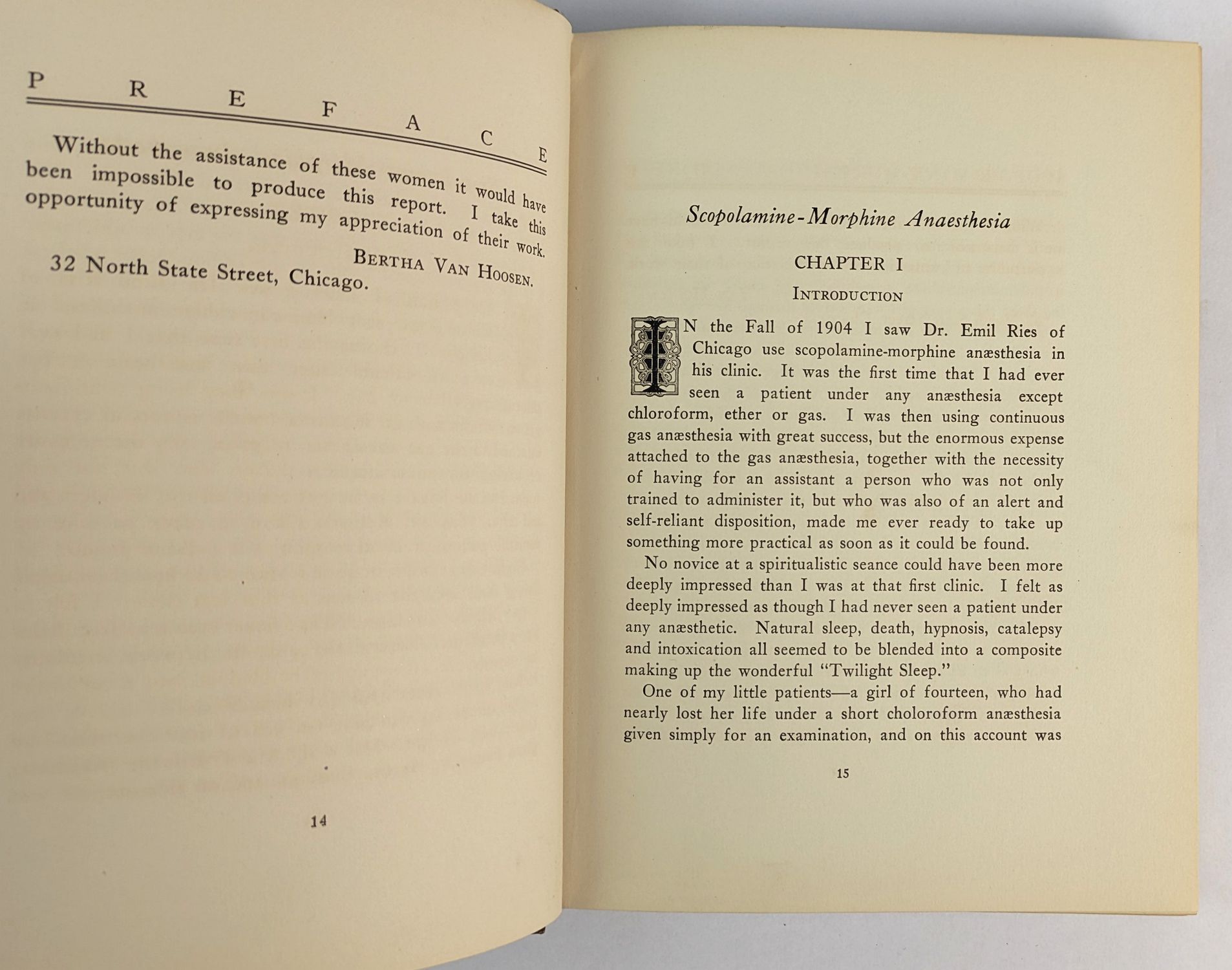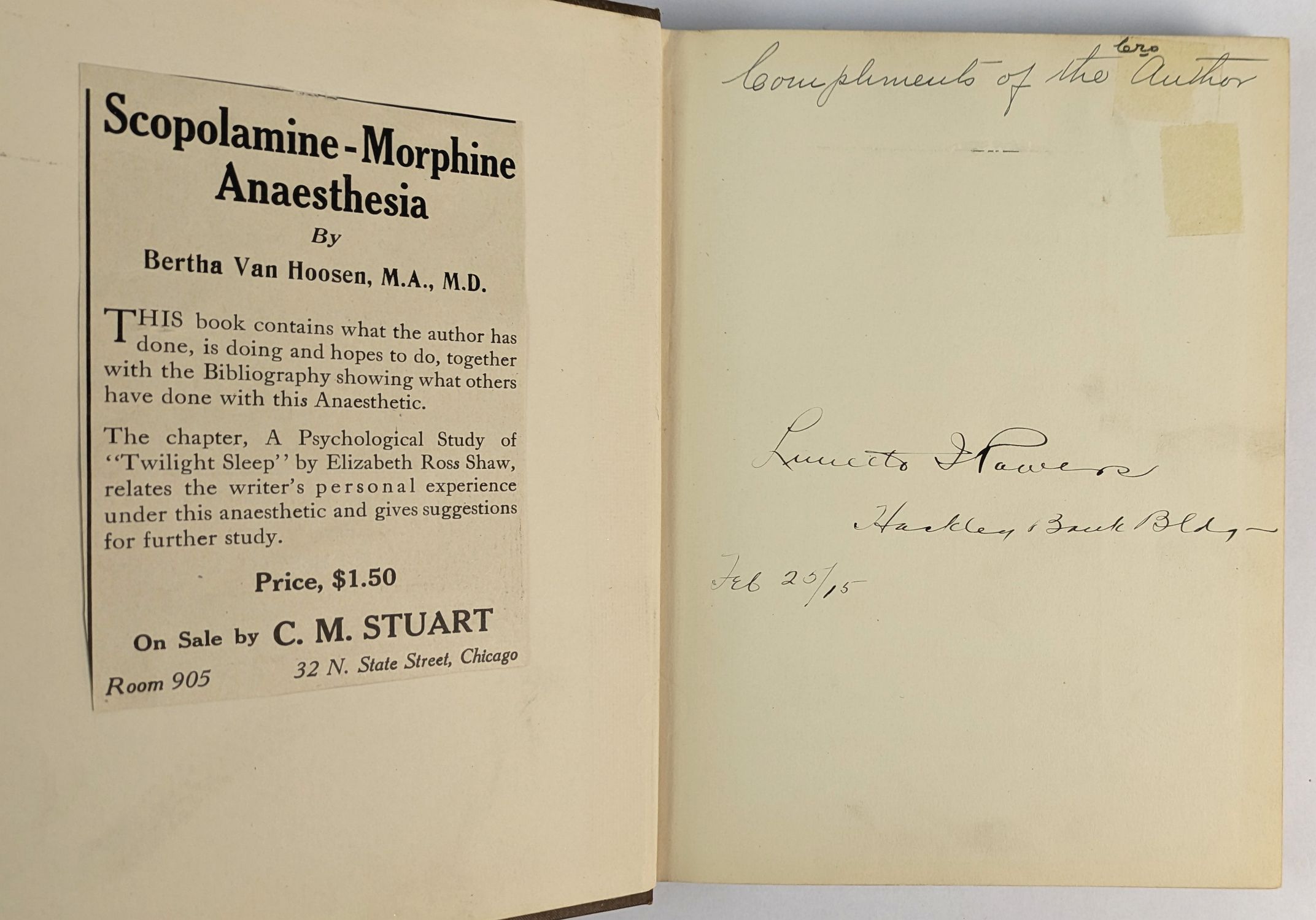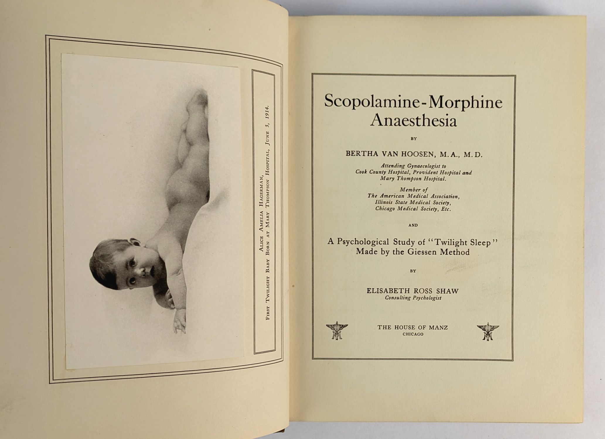 Van Hoosen (1863-1952), pioneering American surgeon, was the first woman to head a surgical department at a coeducational university and a co-founder of the American Medical Women’s Association in 1915. She was a leading American advocate of scopolamine-morphine anaesthesia in obstetrics, the so-called Twilight Sleep method developed at the University of Freiburg. The technique, which rendered patients semiconscious and eliminated memory of labour pain, became the subject of a national campaign intersecting with first-wave feminist and suffrage-era activism following a widely-read 1914 McClure’s Magazine expose. Van Hoosen’s text, drawing on extensive clinical experience, covers the method’s application in both general surgery and obstetrics, with Shaw contributing a psychological study of patients under the Giessen protocol. Illustrated with a mounted photographic frontispiece and fifteen plates. This copy with a presentation inscription by the author.