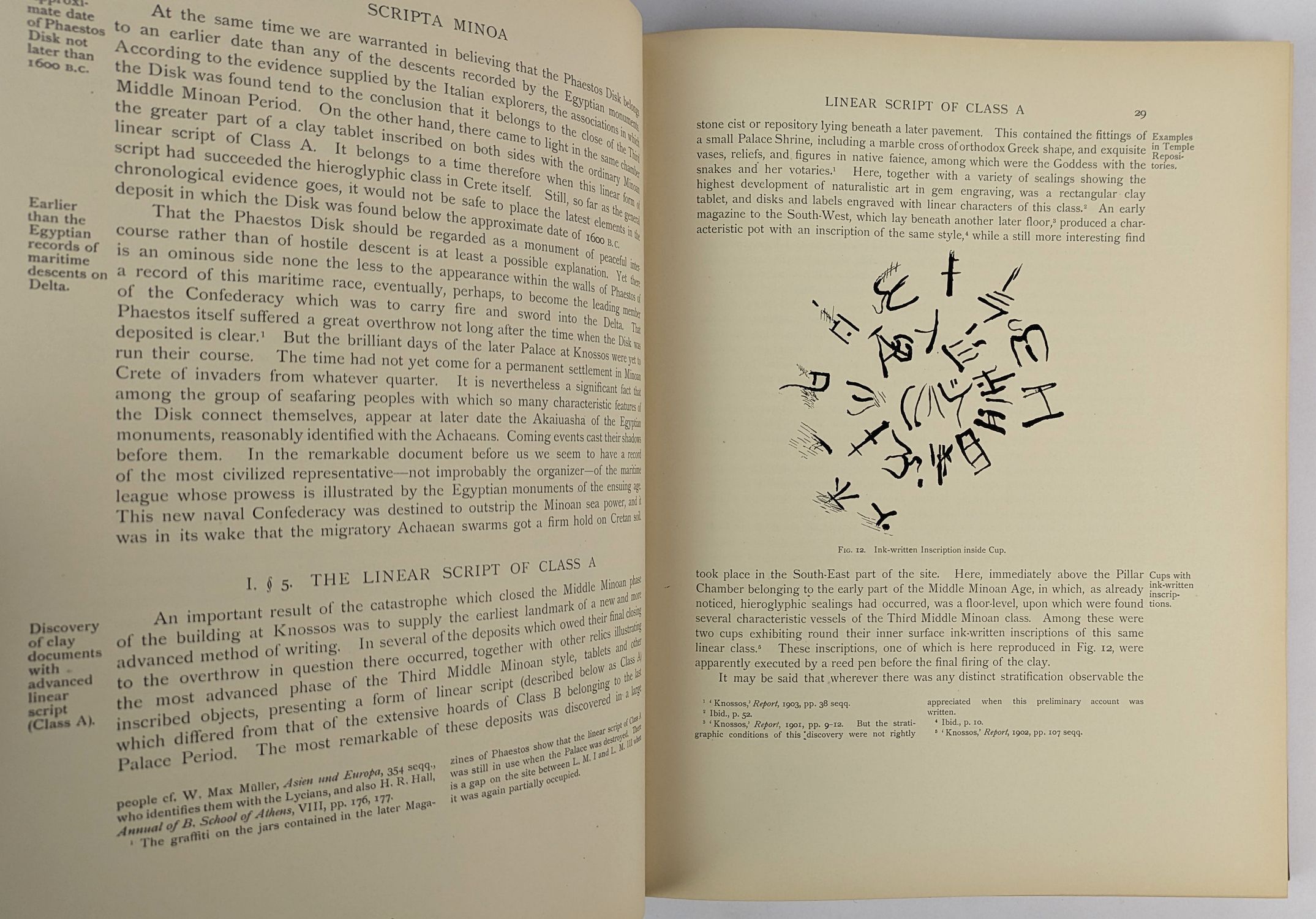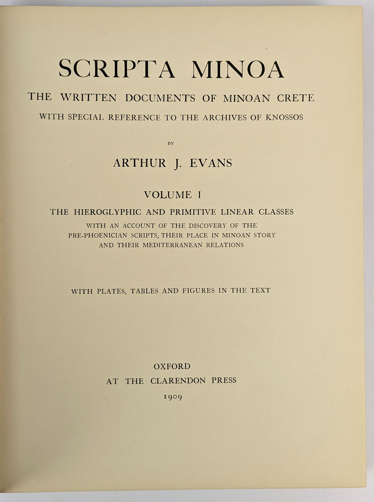 The Written Documents of Minoan Crete with Special Reference to the Archives of Knossos. Volume I: The Hieroglyphic and Primitive Linear Classes with an account of the discovery of the pre-Phoenician scripts, their place in Minoan story and their Mediterranean relations. Volume I only, Volume II was not published until 1952.