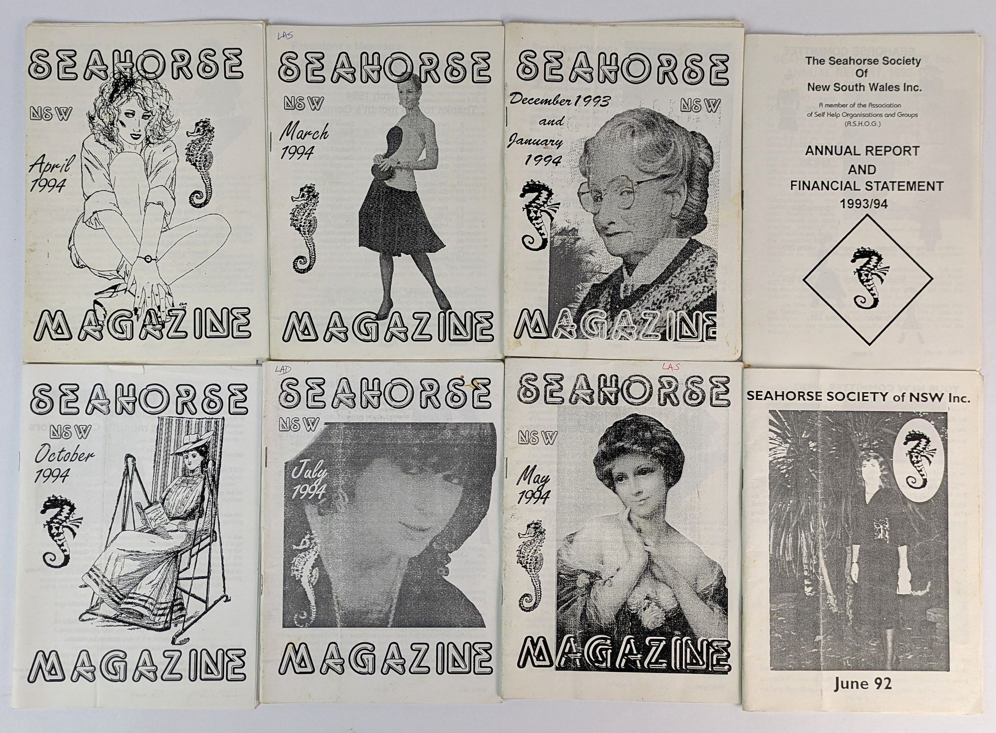 Collection of newsletters and a report issued by the Australian crossdressing organisation The Seahorse Society. Founded in 1971, “the club identified as being for heterosexual transvestites, intentionally distinguishing themselves from homosexuals, fetishists and transsexuals. This was part of an effort to portray transvestism as ‘normal’ and club membership as respectable.” (Noah Riseman: Transgender Australia: A History Since 1910) From the late 1990s, Seahorse began evolving to adopt broader transgender language and advocacy, and is now regarded as Australia’s earliest known trans organisation. The collection comprises: The Seahorse Society of NSW Inc. newsletter (June 1992); The Seahorse Society of New South Wales Inc. Annual Report and Financial Statement (1993–94); and six issues of Seahorse Magazine: December 1993/January 1994, March 1994, April 1994, May 1994, July 1994, and October 1994.