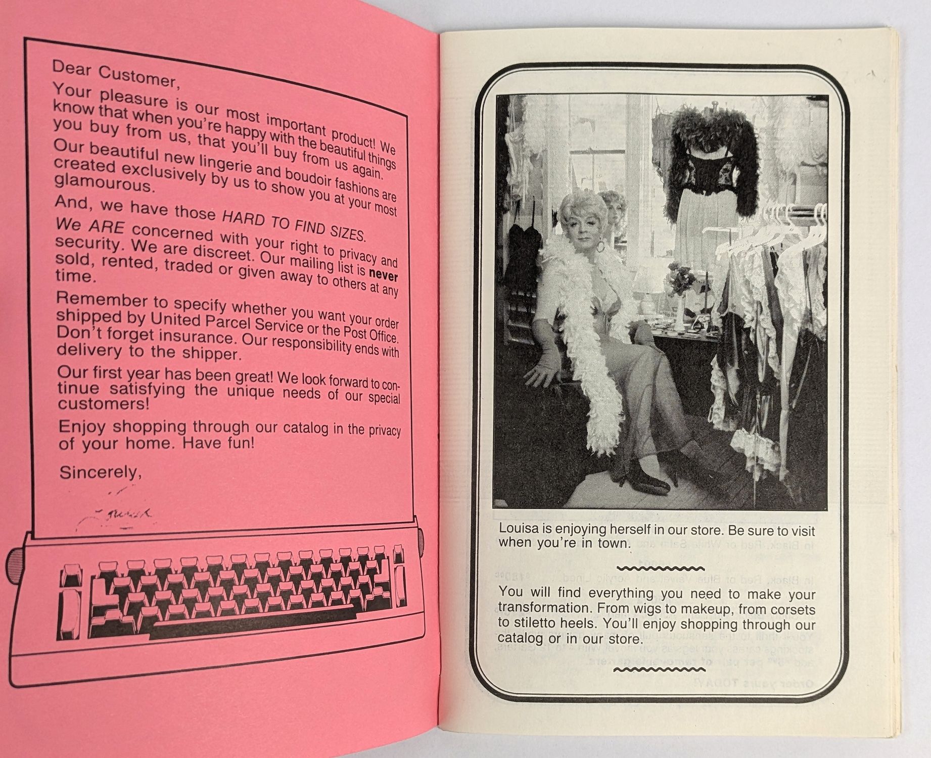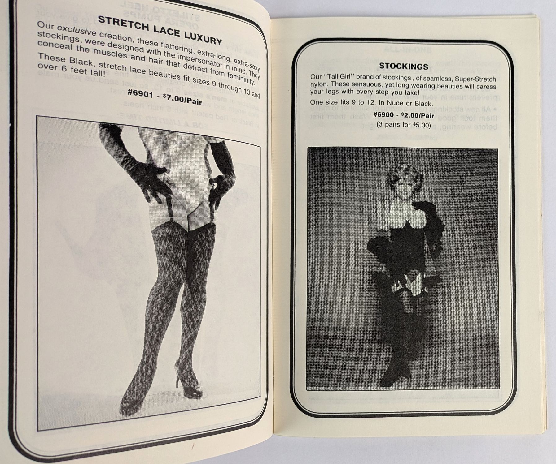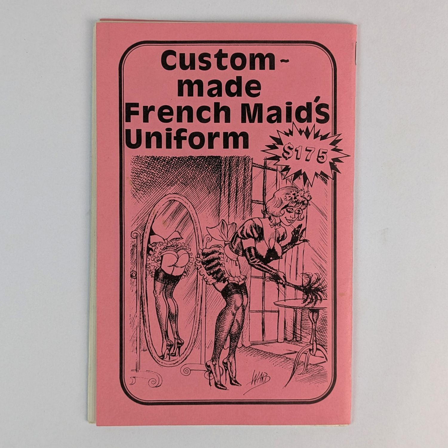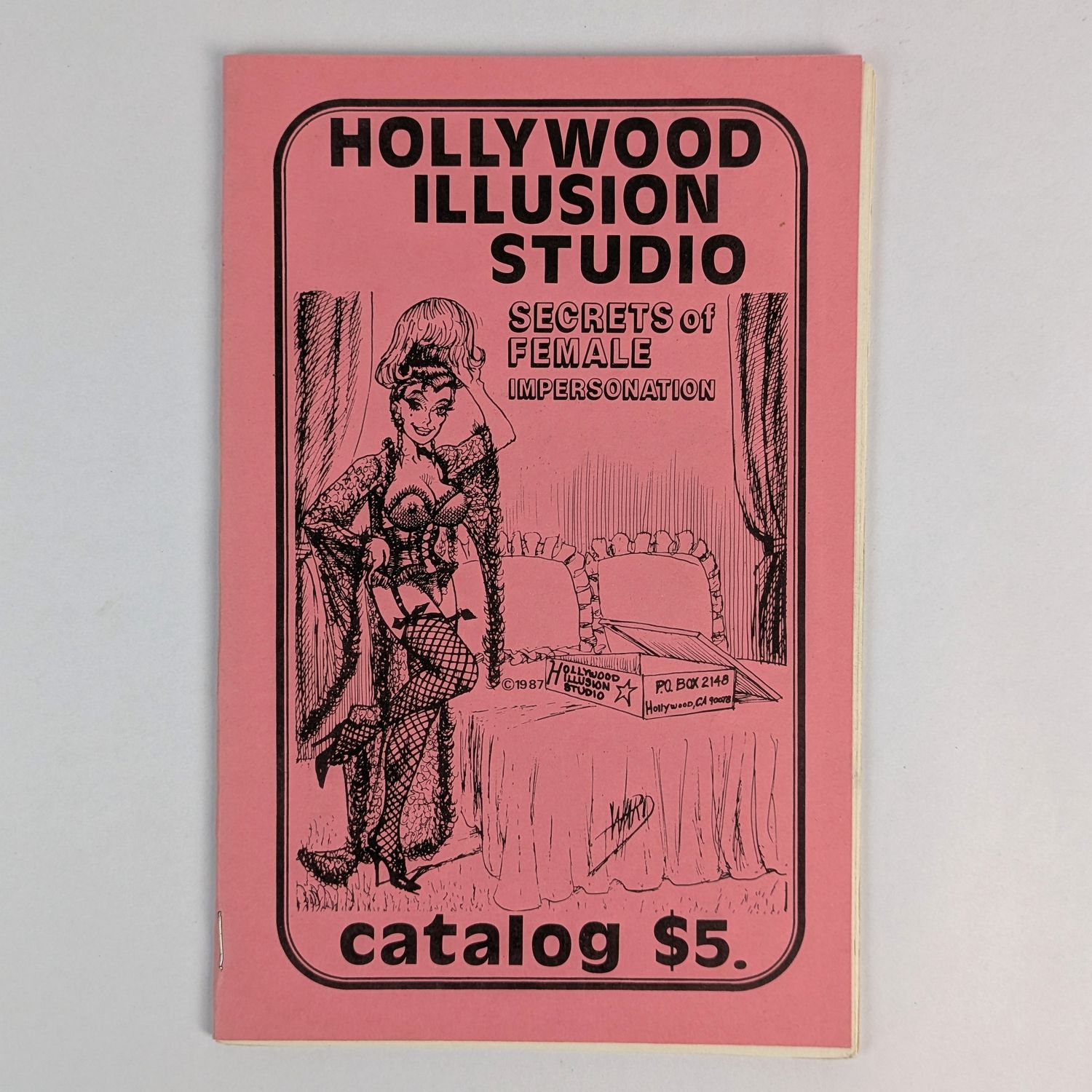 Late 1980s mail-order catalogue offering a comprehensive range of products for male-to-female crossdressing, including corsetry, waist cinchers, brassieres, breast forms, hosiery, garter belts, high-heeled shoes, gloves, wigs, and artificial nails. Features a sizing chart and practical guidance notes aimed at transvestites. Covers and one interior illustration by the pin-up artist Bill Ward.