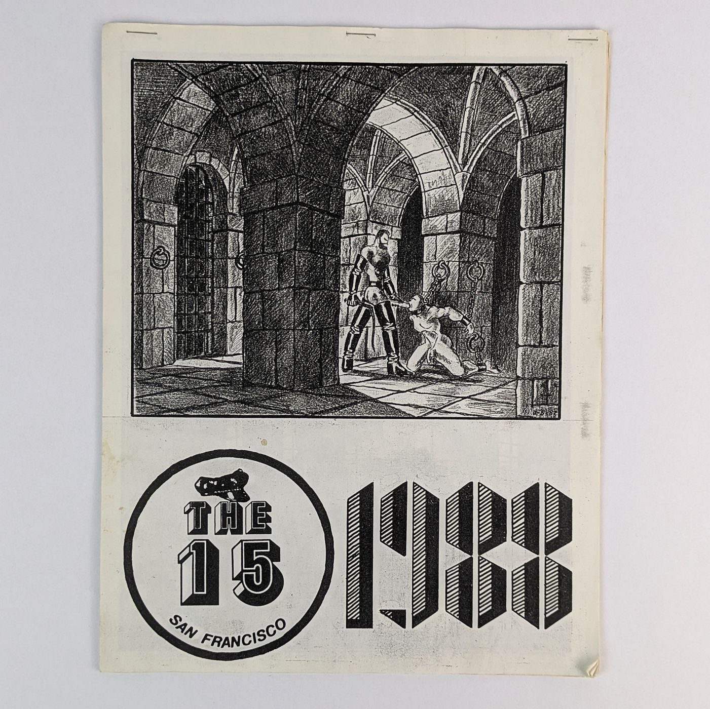 1988 calendar for the social and sexual fraternity for men who engage in BDSM featuring 13 dungeon illustrations by Les Farnak, then chairman of the association. The monthly group fetish nites, and the eighth anniversary event listed.