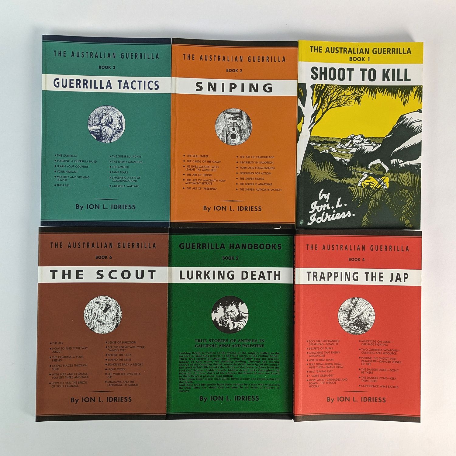 A complete set of the facsmile edition of The Australian Guerilla series limited to 500 copies. Originally published during World War II at the height of the threat of invasion following the bombing of Darwin and continued air raids on Australia. Idriess had been a sniper during World War I. Full list of titles: 1. Shoot to Kill; 2. Sniping; 3. Guerrilla Tactics; 4. Trapping the Jap; 5. Lurking Death; 6. The Scout.