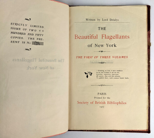 One of the heights of romantic flagellation literature and one of Carrington’s scarcest publications. This copy printed on India paper for Carrington by Noel Texier. MENDES 178 (though he only examined a copy printed on Van Gelder Dutch paper, however he found references to copies on three papers in an inventory list drawn up in 1930 by Carrington’s successors, Frank Groves and Henri Michaux. Limited to 250 numbered copies, of which this is number 138 (though possibly a married set or a publisher’s fault with volumes 2 & 3 reading 120 with 38 inked over to read 138).
