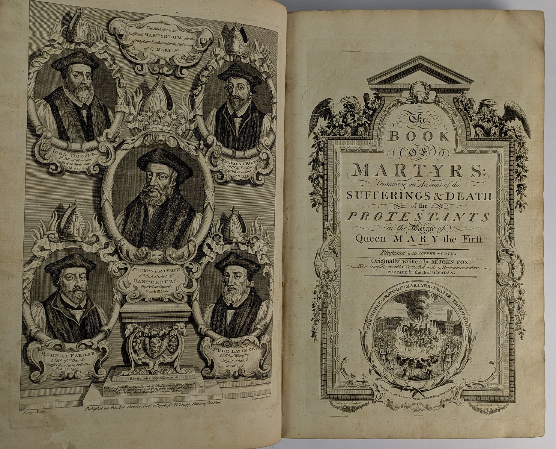 18th-century folio edition of Foxe’s Book of Martyrs, here edited by the English barrister and clergyman Martin Madan, better known for his 1780 work advocating polygamy, Thelyphthora, or A Treatise on Female Ruin. This copy with 30 plates, as called for, however some of the plates bound in a different order and the plate of The Burning of Rose Allin replaced with the plate of The Body and Bones of Wickliff Taken Up and Burned from the separately issued The Lives of the Primitive Martyrs.