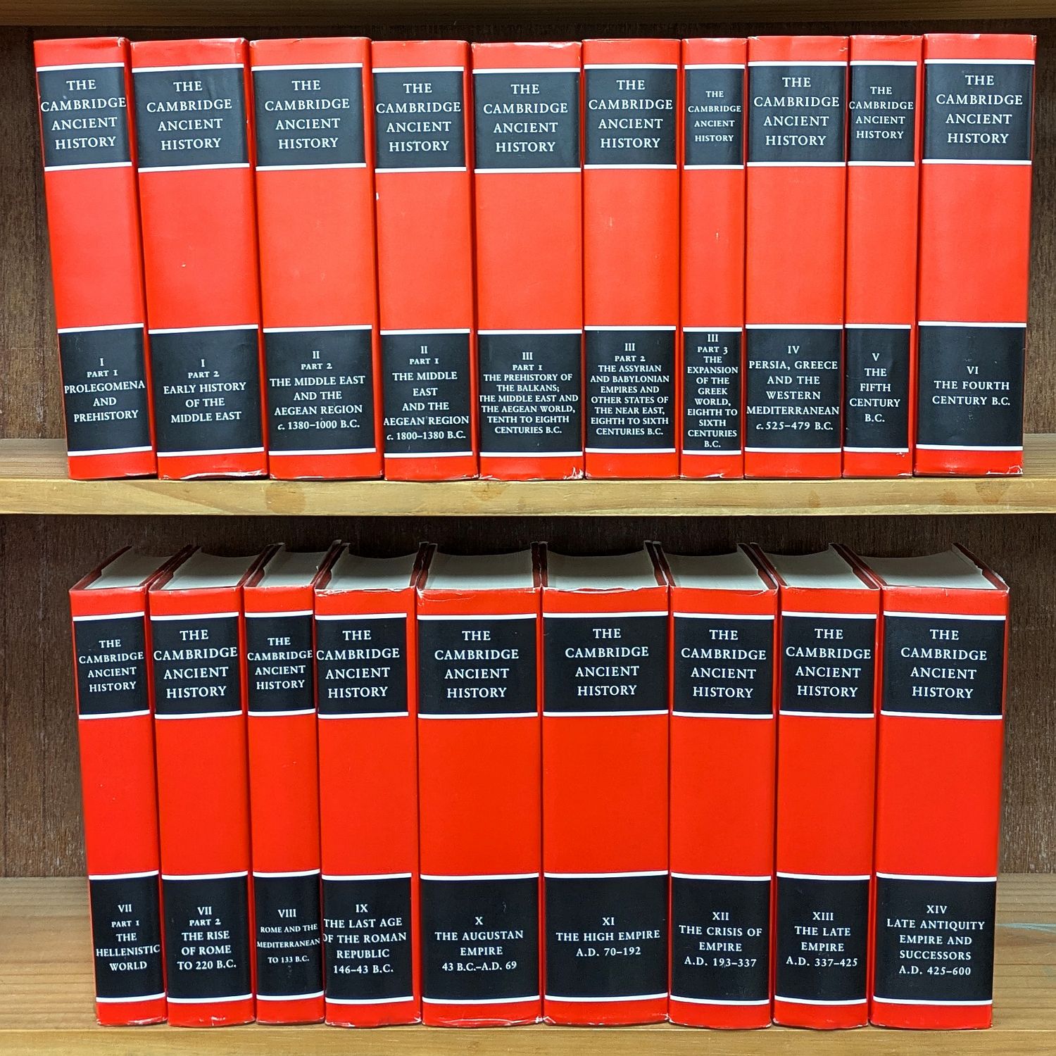 Complete set of the second series. “Over the past half century The Cambridge Ancient History has established itself as a definitive work of reference. The original edition was published in twelve text volumes between 1924 and 1939. Publication of the new edition began in 1970. Every volume of the old edition has been totally re-thought and re-written with new text, maps, illustrations and bibliographies.” (publisher’s blurb) Vol. I Part 1 printed in 2006, all other volumes in 2007. Volume I Part I: Prolegomena and Prehistory; Part II: Early History of the Middle East; Vol. II Part I: History of the Middle East and the Aegean Region c.1800-1380; Part II: History of the Middle East and the Aegean Region c.1380-1000; Vol. III Part I: The Prehistory of the Balkans; and the Middle East and the Aegean world, tenth to eighth centuries B.C.; Part II: The Assyrian and Babylonian Empires and other States of the Near East, from the Eighth to the Sixth Centuries B.C; Part III: The Expansion of the Greek World, Eighth to Sixth Centuries B.C; Vol. IV: Persia, Greece and the Western Mediterranean C. 525 to 479 B.C.; Vol. V: The Fifth Century B.C.; Vol. VI The Fourth Century B.C.; Vol. VII, Part I: The Hellenistic World; Part II: The Rise of Rome to 220 B.C.; Vol. VIII: Rome and the Mediterranean to 133 B.C.; Vol. IX: The Last Age of the Roman Republic, 146-43 B.C.; Vol. X: The Augustan Empire, 43 B.C.-A.D. 69; Vol XI: The High Empire, A.D. 70-192; Vol. XII The Crisis of Empire, A.D. 193-337; Vol. XIII: The Late Empire, A.D. 337-425; Vol. XIV: Late Antiquity: Empire and Successors, A.D. 425-600.