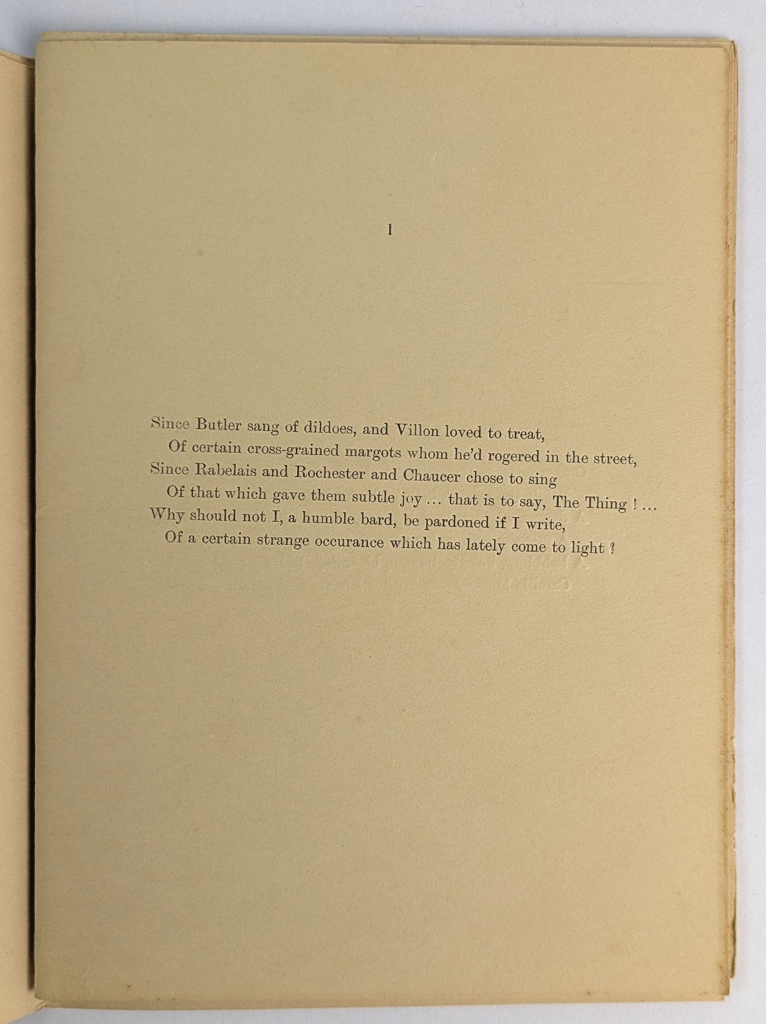 The vulgarity of the sexual slang in this scurrilous, pseudonymously published piece of verse would have been regarded in 1938 Australia as being at the very extremes of obscenity. Written and “hand-printed for subscribers only” by bibliophile Colin Berckelman in an (unsurprisingly) small edition of 25 copies, the publication can now be considered a genuine rarity: 11 of the 25 copies have found their way into public collections. Berckelman’s use of the non-de-plume Eugene Field is almost certainly an allusion to the late nineteenth century American writer of the same name who, aside from producing poetry for young readers, wrote The Love Affairs of a Bibliomaniac (1896). Berckelman, for reasons that were either genuine or perverse, evidently felt some affinity with Field. “On top, the pumping method; or lying on the side, Or spread upon her billowing bum, a-la the blushing bride, Or stand up, or sitting down, or resting on all four, Whereby the visitor could take his choice of either door, Or dressed, or naked,… every way her genius could invent To catch the silvery substance that tickleth as ’tis spent.”