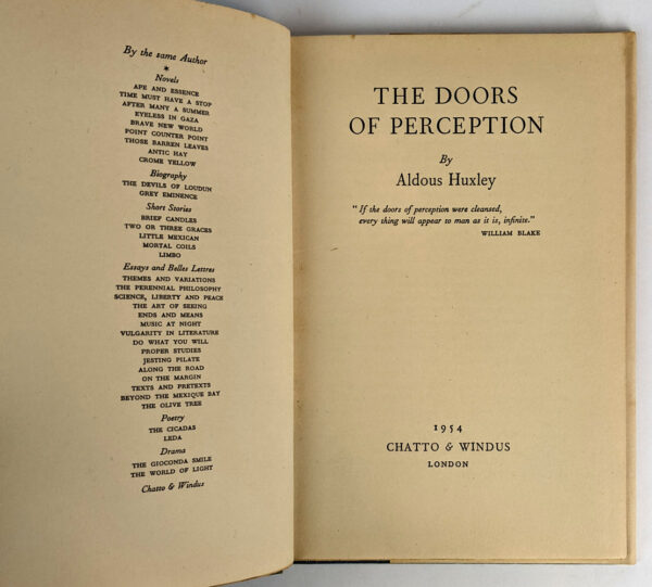 First Edition of Huxley’s classic psychedelic essay, The Doors of Perception, wherein he recalls his first experience on mescaline. The first English Edition with the jacket designed by John Woodcock. BROMER A68.2.