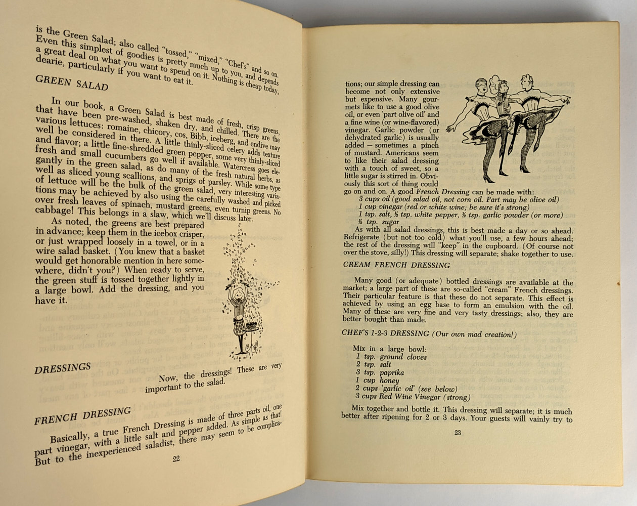 First edition, first printing, of “the complete compendium of campy cuisine and menus for men…or what have you” by Chef Lou Rand Hogan. Campy cartoons by David Costain. The first cookbook marketed to the gay man. Hogan, after a failed attempt at a career in show business, learned the art of cooking fine cuisine working luxury cruises where he was part of a deliciously camp work culture, the humour of which is evident in his writing style. A good copy of this early example of positive gay culture in 20th century print media.