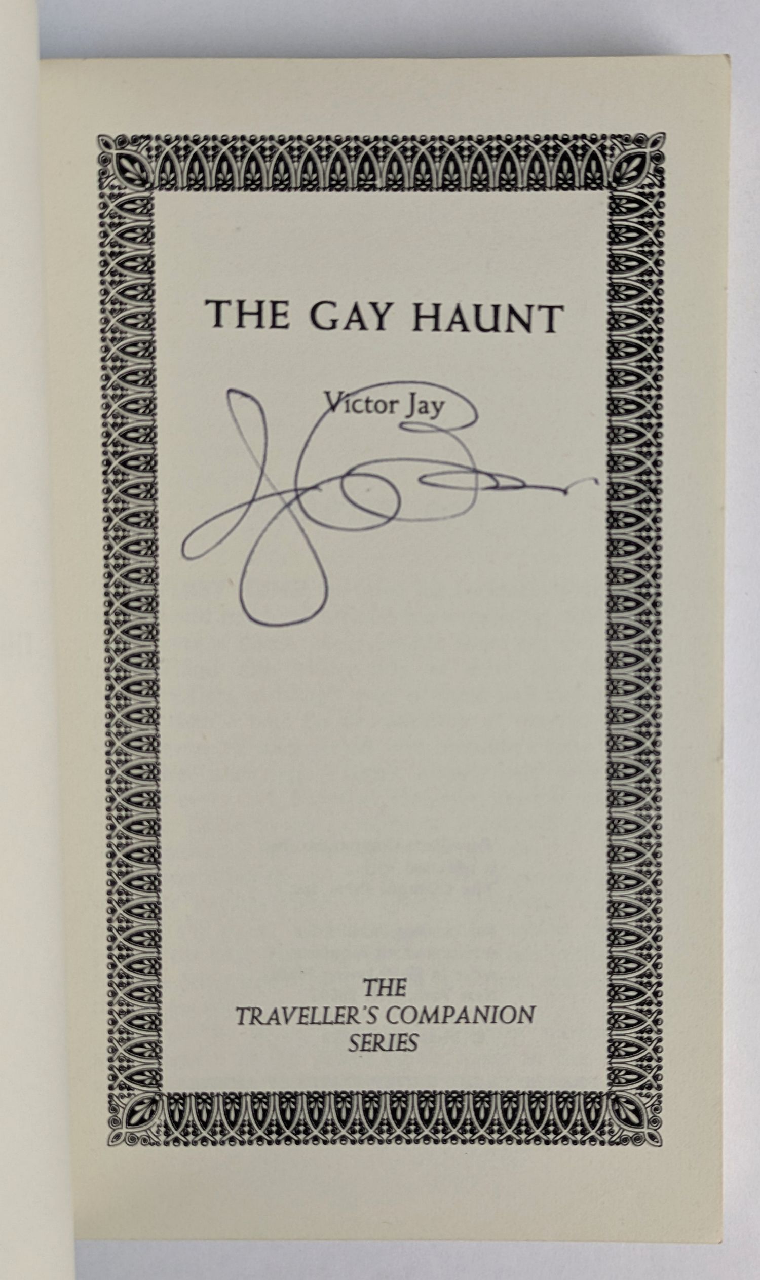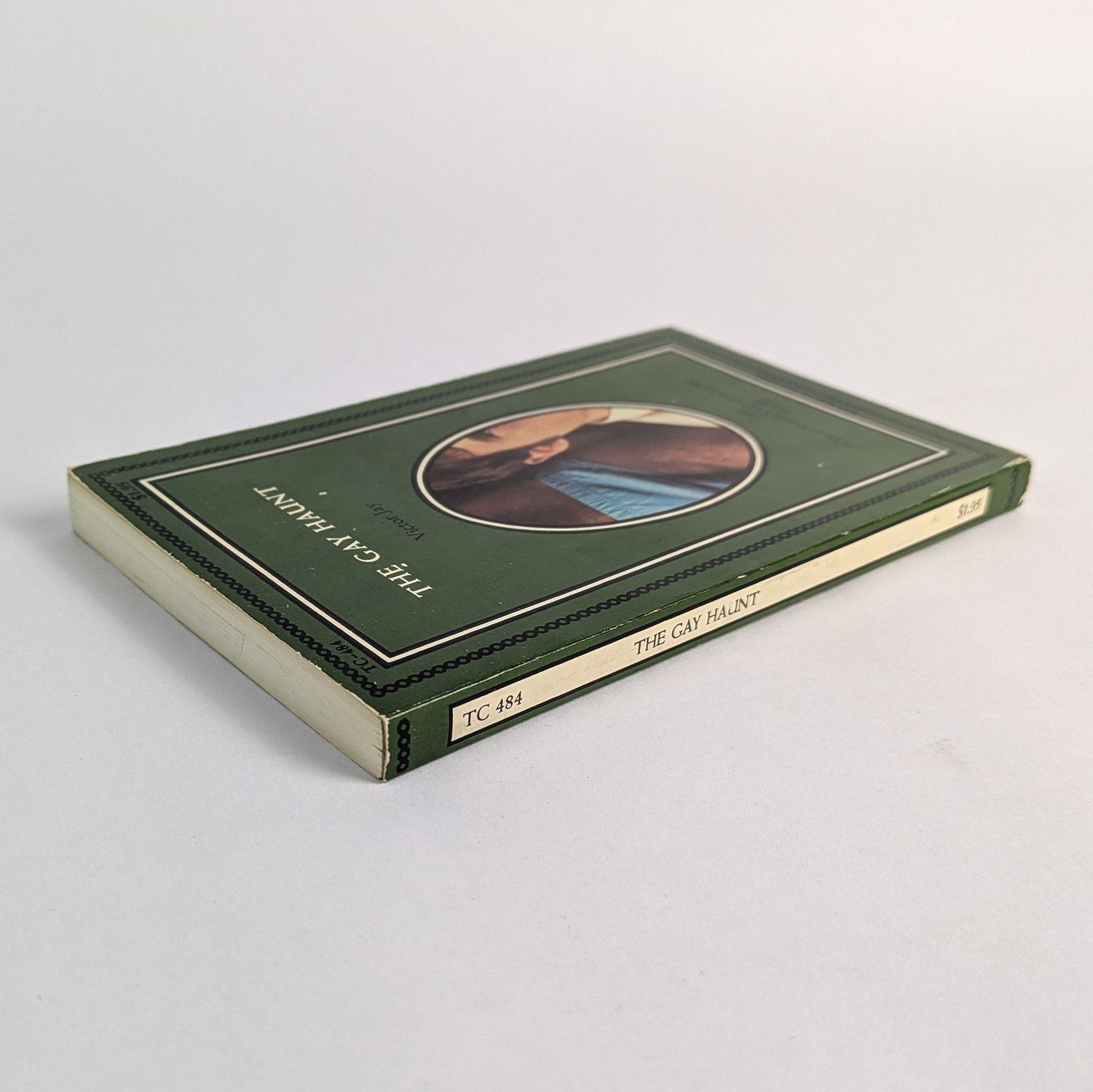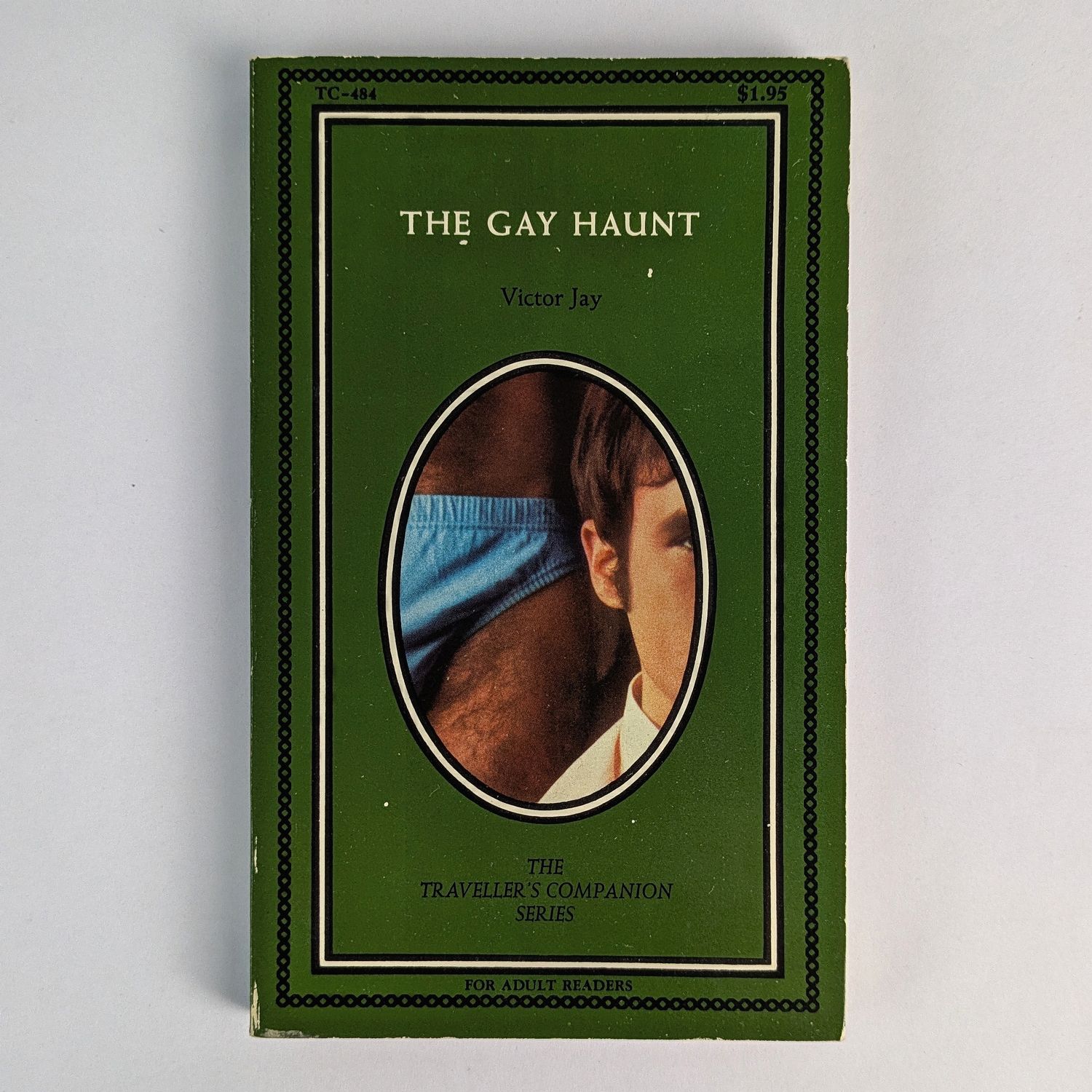 Gay pulp fiction by Victor J. Banis under his Victor Jay pseudonym, one of several he employed for his prolific output of gay paperback fiction in the 1960s and 70s. Banis was a pioneering figure in gay genre fiction, among the first American writers to place openly gay protagonists at the centre of mass-market paperbacks, not as villains, victims, or cautionary figures, but as sympathetic leads in adventure, mystery, and comedy. Part of Maurice Girodias’ The Olympia Press Traveller’s Companion Series, TC-484. “Can a handsome young gay stud go straight and marry the boss’s daughter? Sure, if the amorous ghost of his late boyfriend doesn’t materialize naked in his car, at his parties, and in his bed.” This copy signed by Banis to the title page.