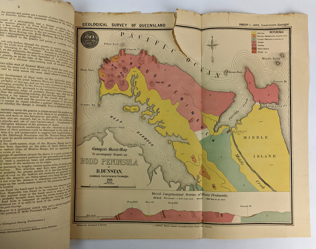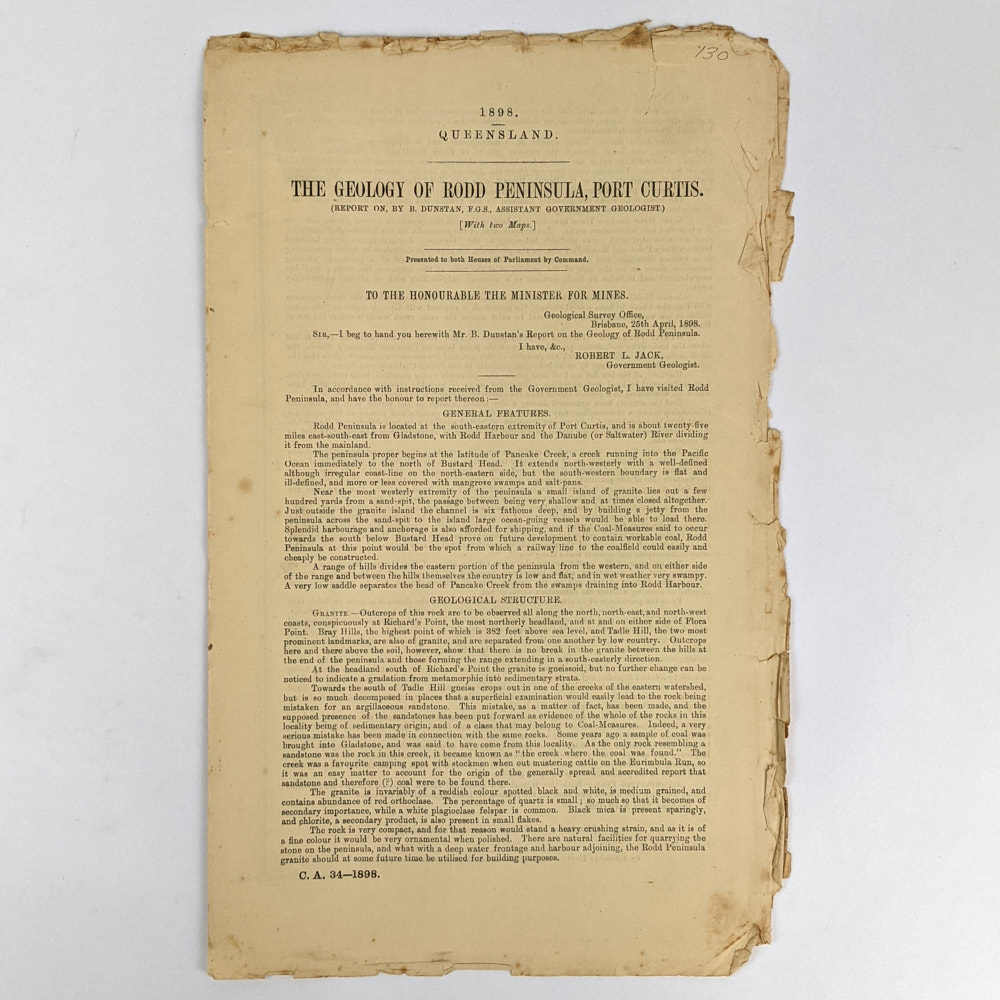 Report by Assistant Government Geologist, Benjamin Dunstan (1864-1933), on the Geology of Rodd Peninsula, Port Curtis, with 2 maps, Geological Survey of Queensland, Geological Sketch Map to accompany report on Rodd Peninsula, 1898, and Local Sketch showing Gladstone, Port Curtis, Bustard Bay, the Munro Range, Edinburg Mountains, Many Peak Range, and other surrounding features.