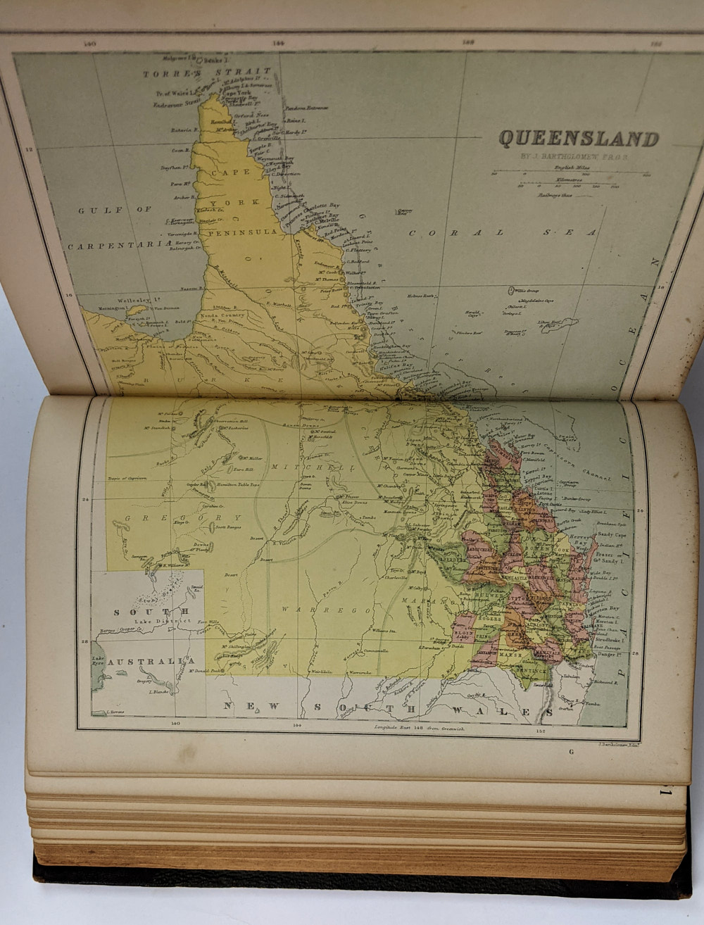 Ex-Congregational Mission, Malvern Library, 2 stamps only to front free endpaper. Leather rubbed and spine crown chipped. Upper hinge cracked, lower hinge split but holding. Several maps have minor splits on the borders, not affecting the image; 3 have longer splits affecting the map, (Nos. 11: 6cm split; 22: 5cm; 53: 11cm). Tanning to edges, very minor tanning to letterpress and map pages. Fair Condition.
