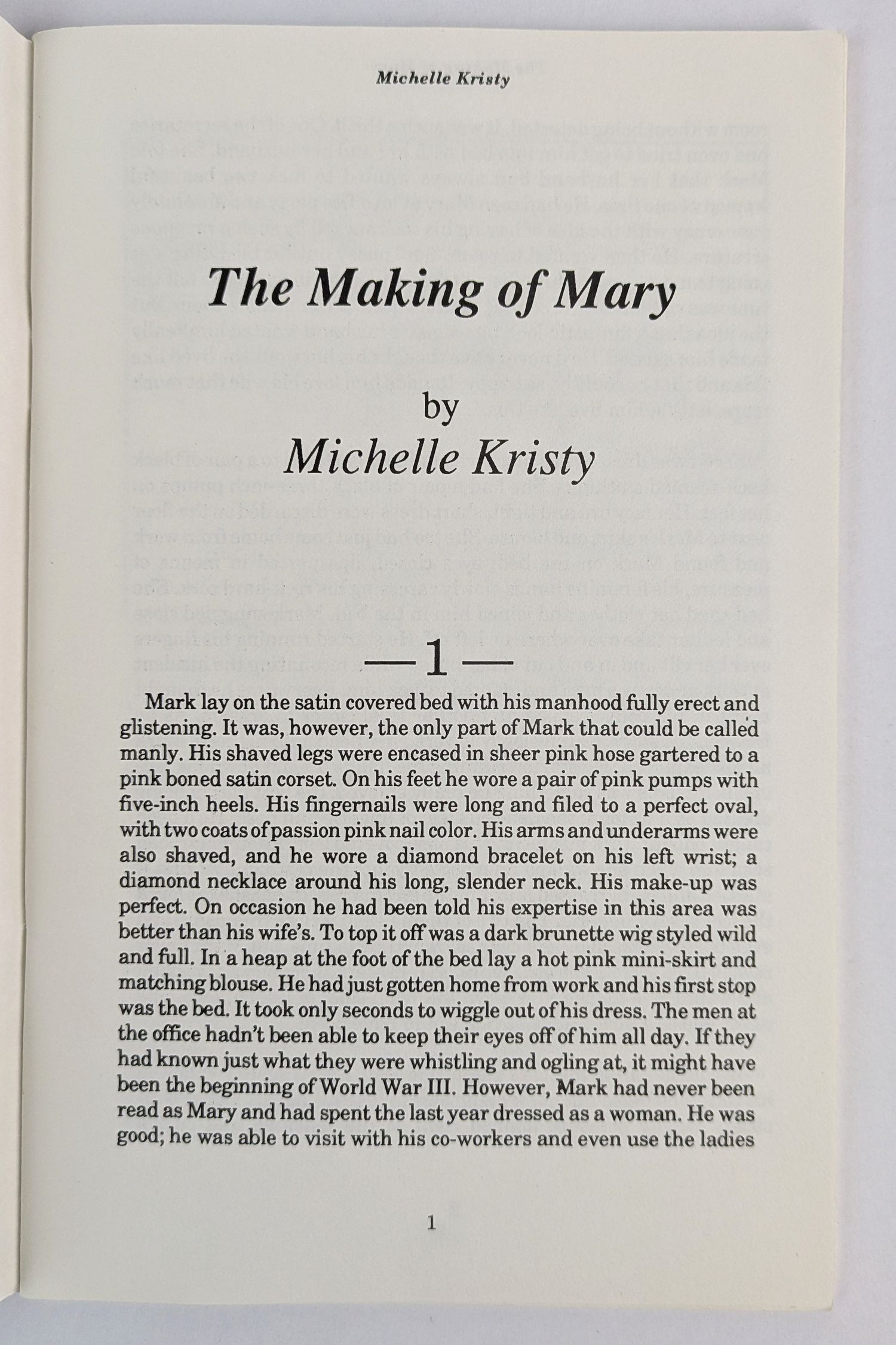 “Follow the transformation of Mark to Mary…” An erotic transitional story with illustrations by the author. Unrecorded in OCLC.