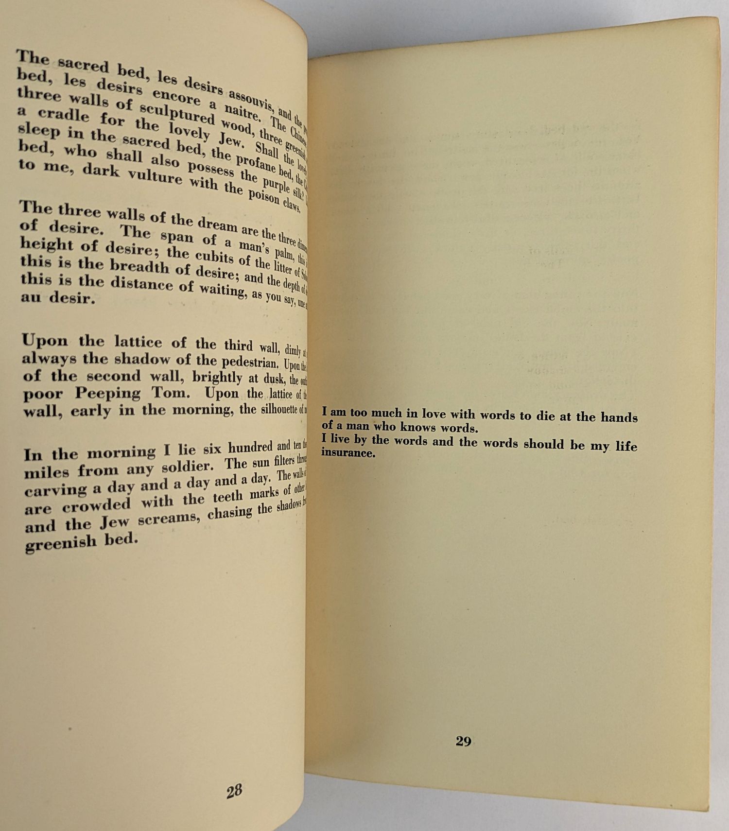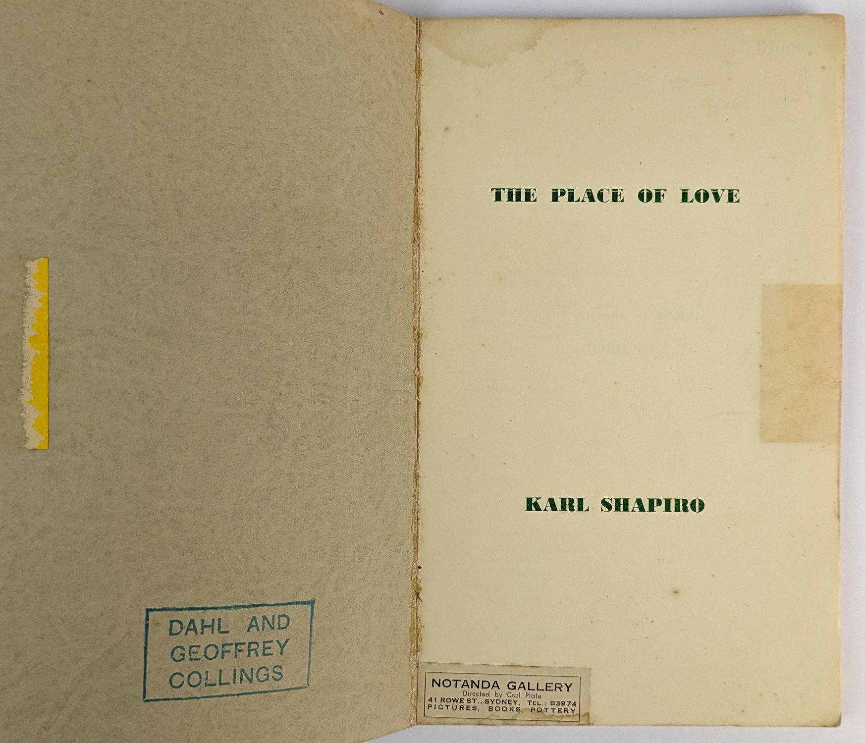 Love poems by the American poet published while stationed in Australia during WWII. “[B]anned by several Australian bookshops because of its explicit love poetry.” (Patricia Clarke, Literary Sidelights in Wartime Brisbane) CAINS 157. This copy from the collection of Australian artists Geoffrey and Dahl Collings, with their stamp, and with the bookseller’s label of Australian painter Carl Plate’s Notanda Gallery, Plate seemingly not ashamed in the slightest.
