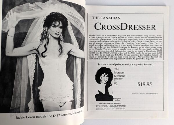 Canadian 1990s catalogue of fashion for the male crossdresser. Includes makeup, wigs, bras, crinolines, skirts, pettipants, maid costumes, and more. Goes a little beyond the standard catalogue with a letter to the editor, and with most items modelled in real life, the copy reads more like a queer drag zine.